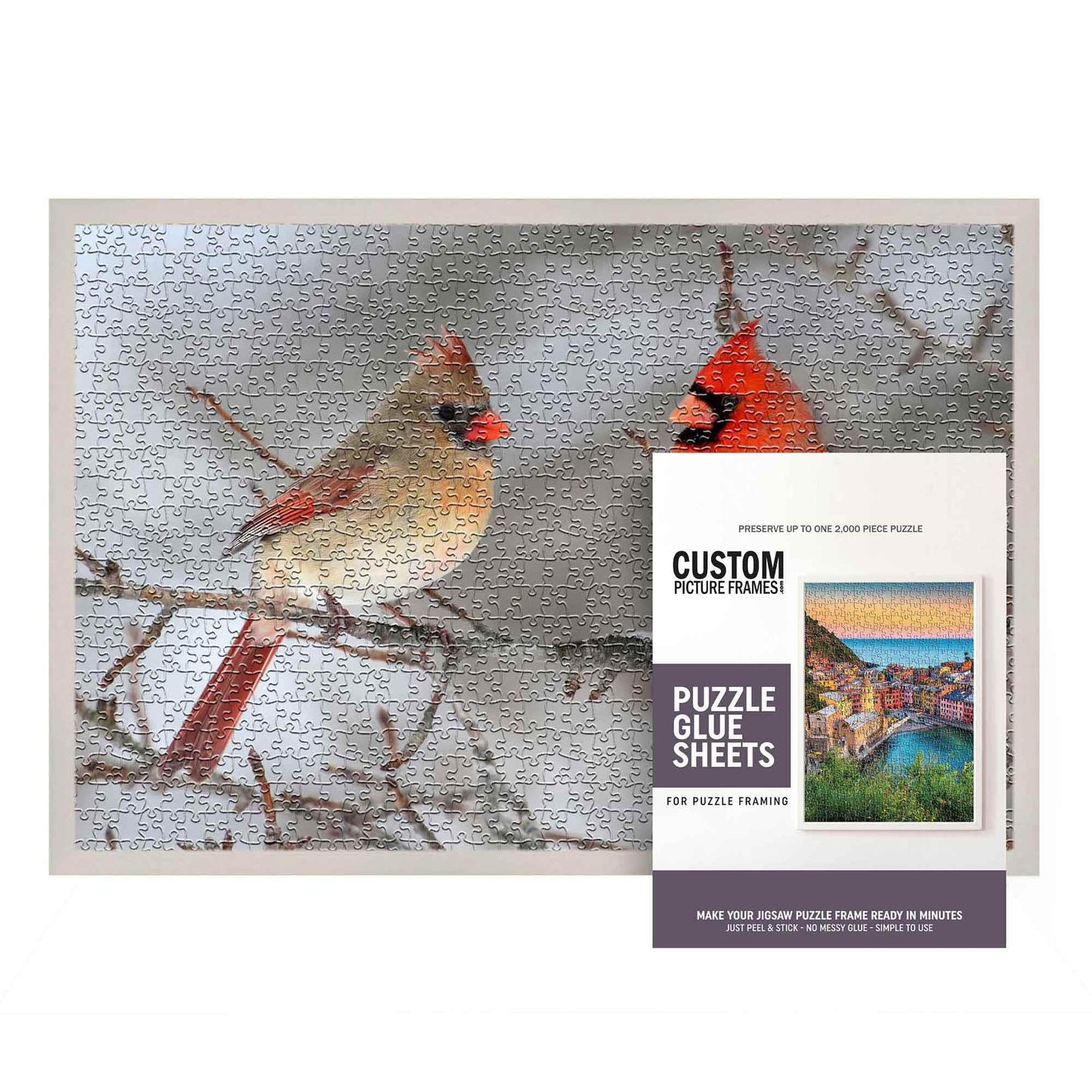 - Q: Does the kit include everything needed for framing? A: Yes, the complete kit includes the solid wooden picture frame, UV acrylic front, foam board backing, wall hanging hardware, and peel and stick puzzle glue sheets for easy preservation of your puzzle.