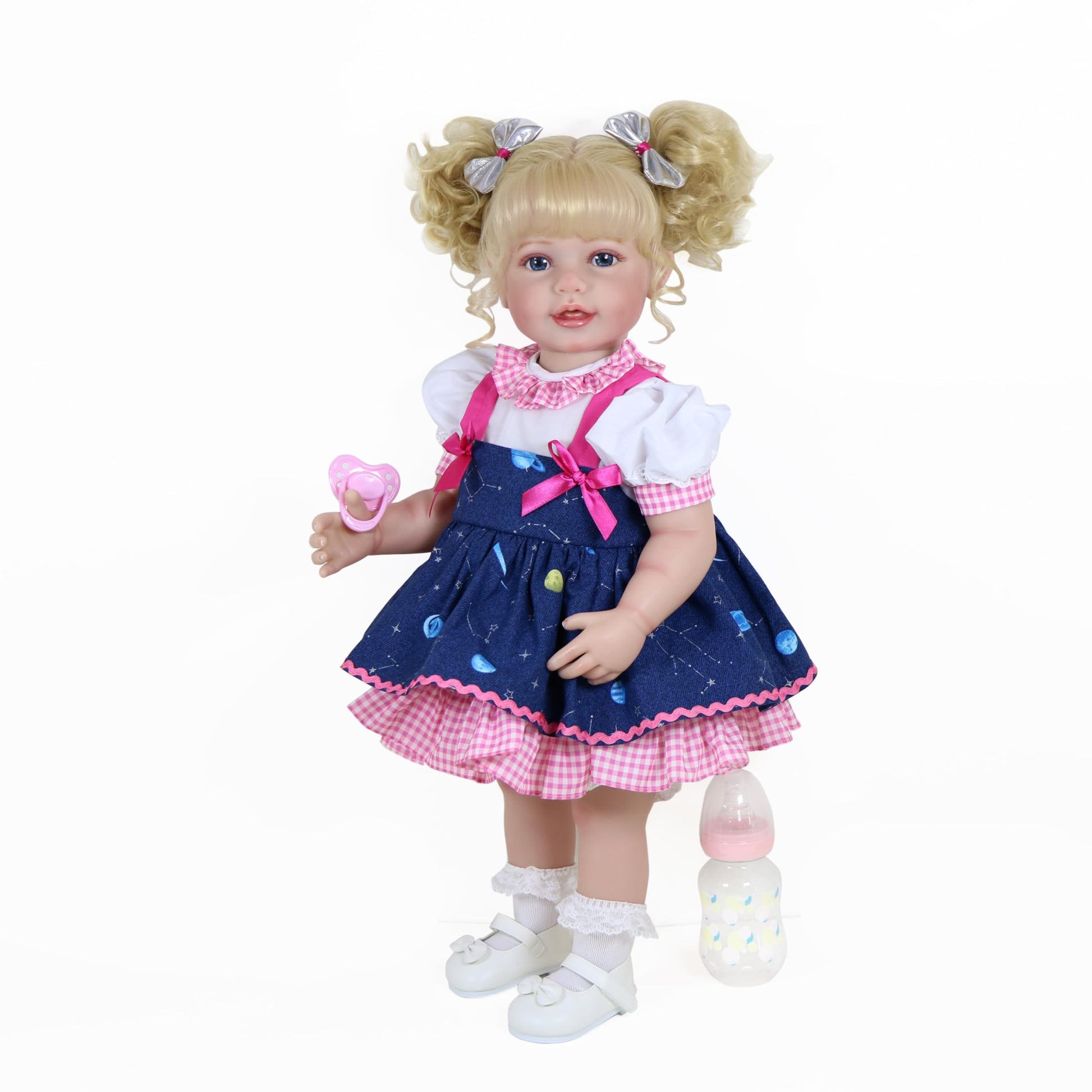 • Q: Does the doll come with accessories? A: Yes, the Galaxia Girl doll comes complete with a baby magnetic pacifier, a pair of shoes, a bottle, a diaper, and an outfit, providing everything your child needs for imaginative play.