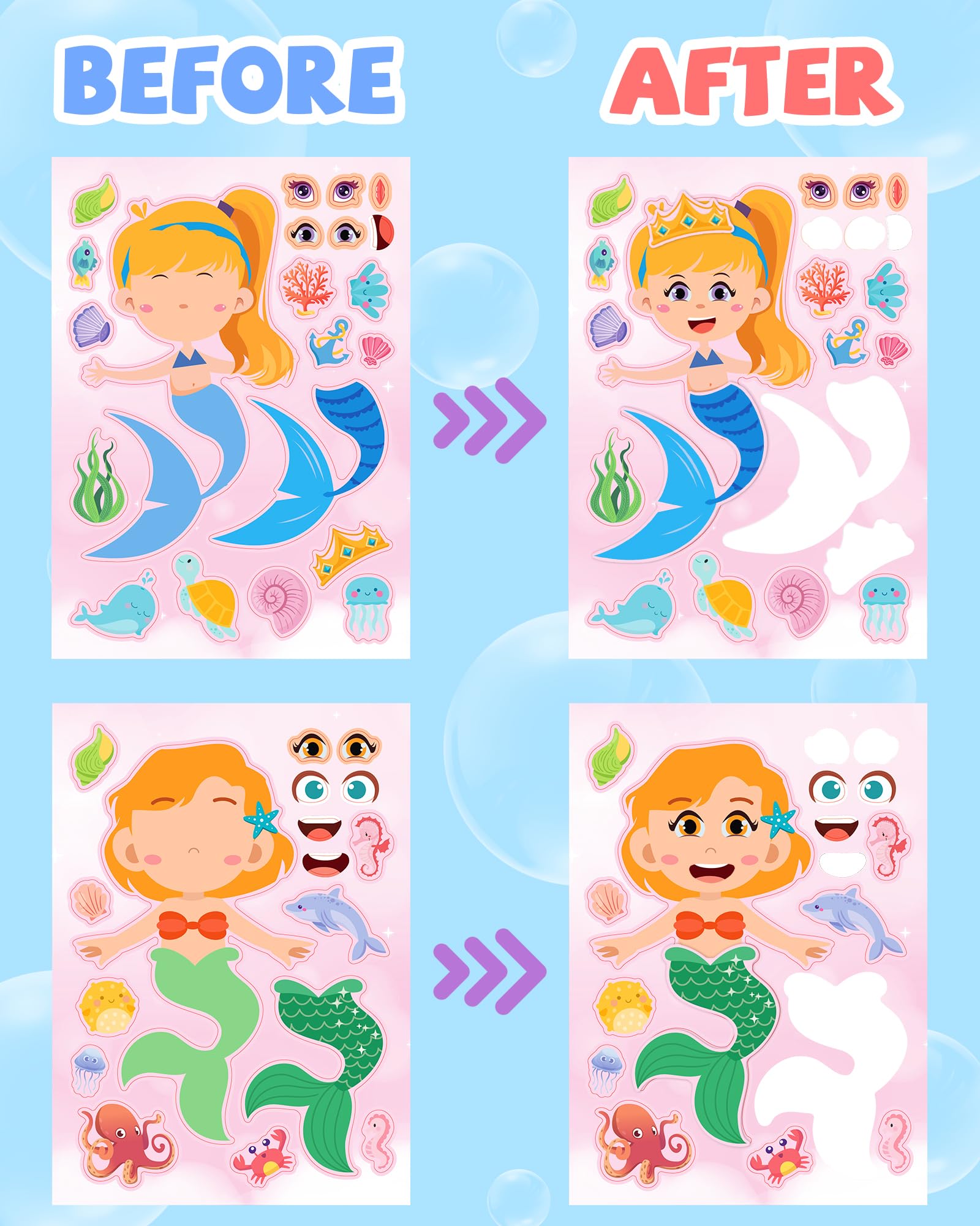 • Q: What types of designs can kids create with these stickers? A: Kids can express their creativity by using the body stickers along with various facial features and accessories included in the sheets to design their unique mermaid stickers.