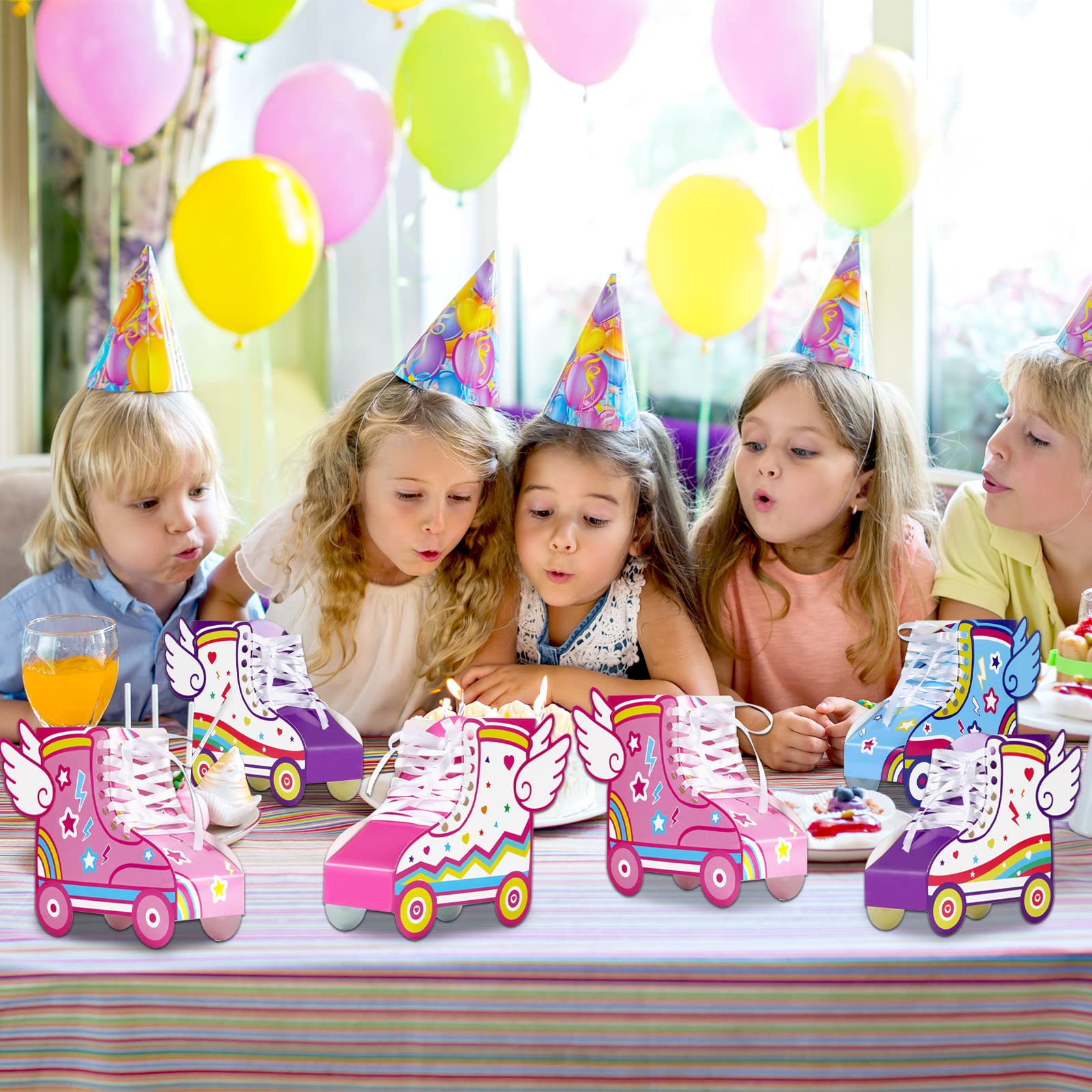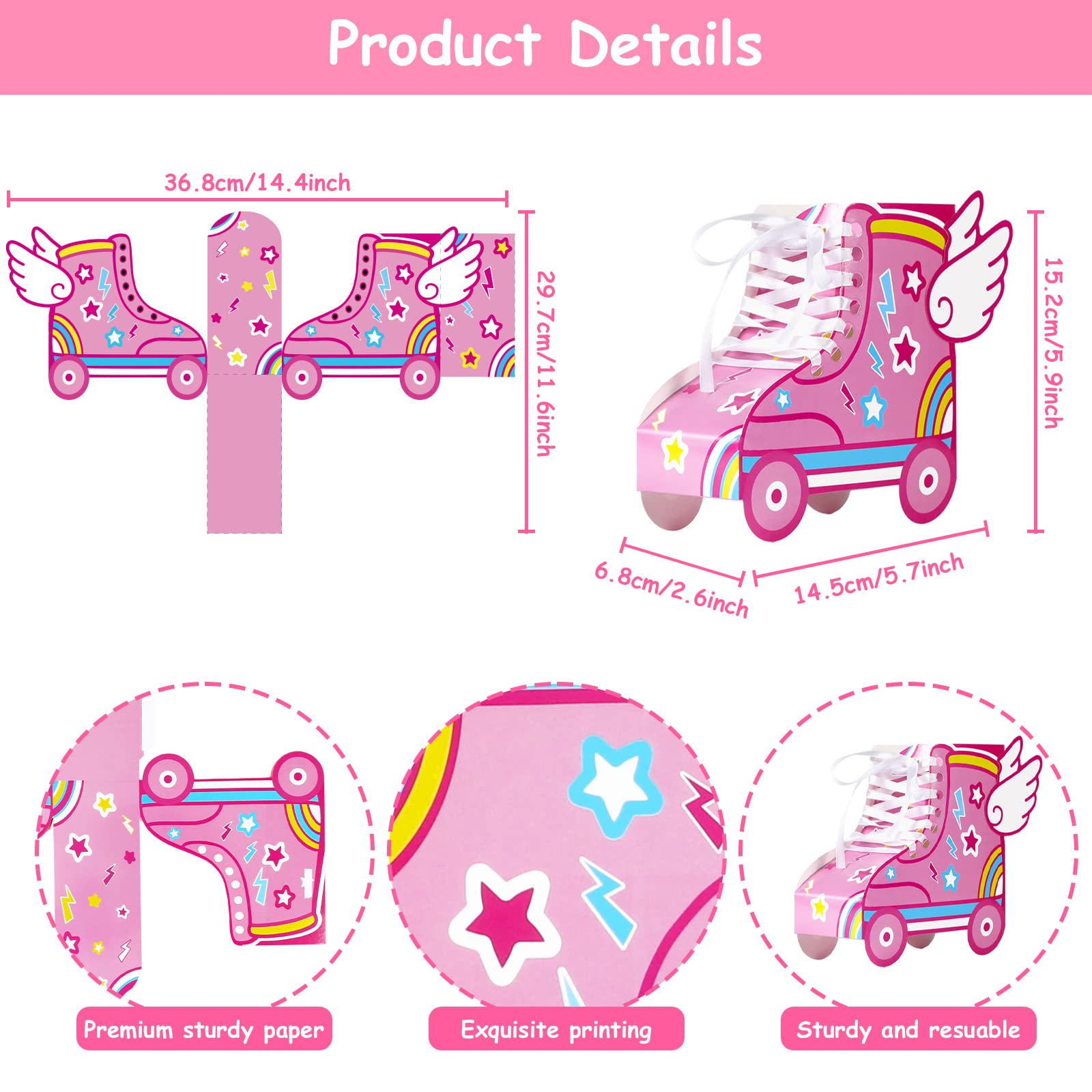 - Q: How many styles of roller skate boxes are included in the package? A: The package includes 24 roller skate party favor boxes in 4 different stylish designs, featuring fun patterns like rainbows, stars, and hearts.