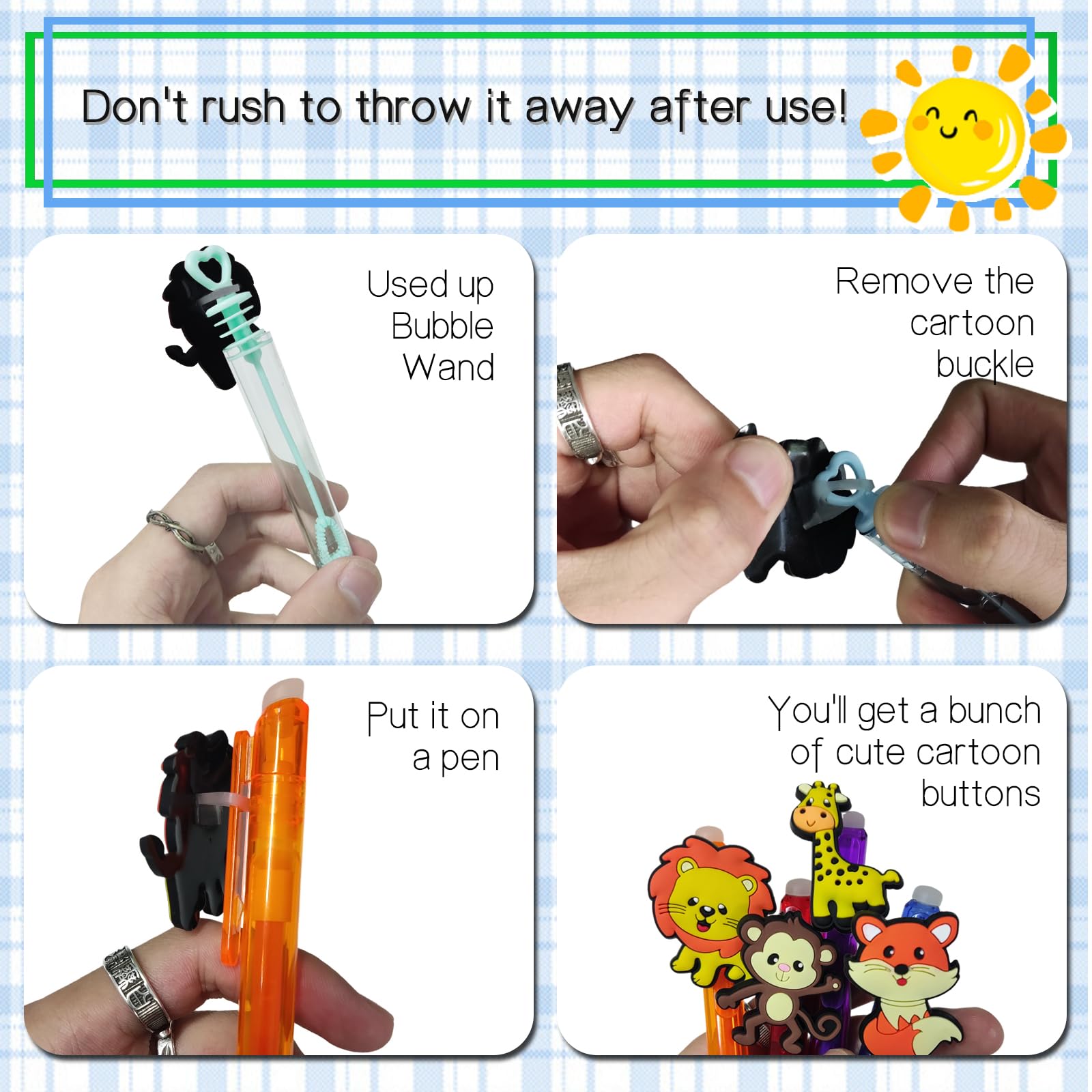 - Q: What makes these bubble wands a great party favor compared to others? A: These bubble wands stand out due to their unique jungle animals designs and bright colors, making them visually appealing to kids. They also provide hours of entertainment as children enjoy blowing bubbles, making them a memorable addition to any party.