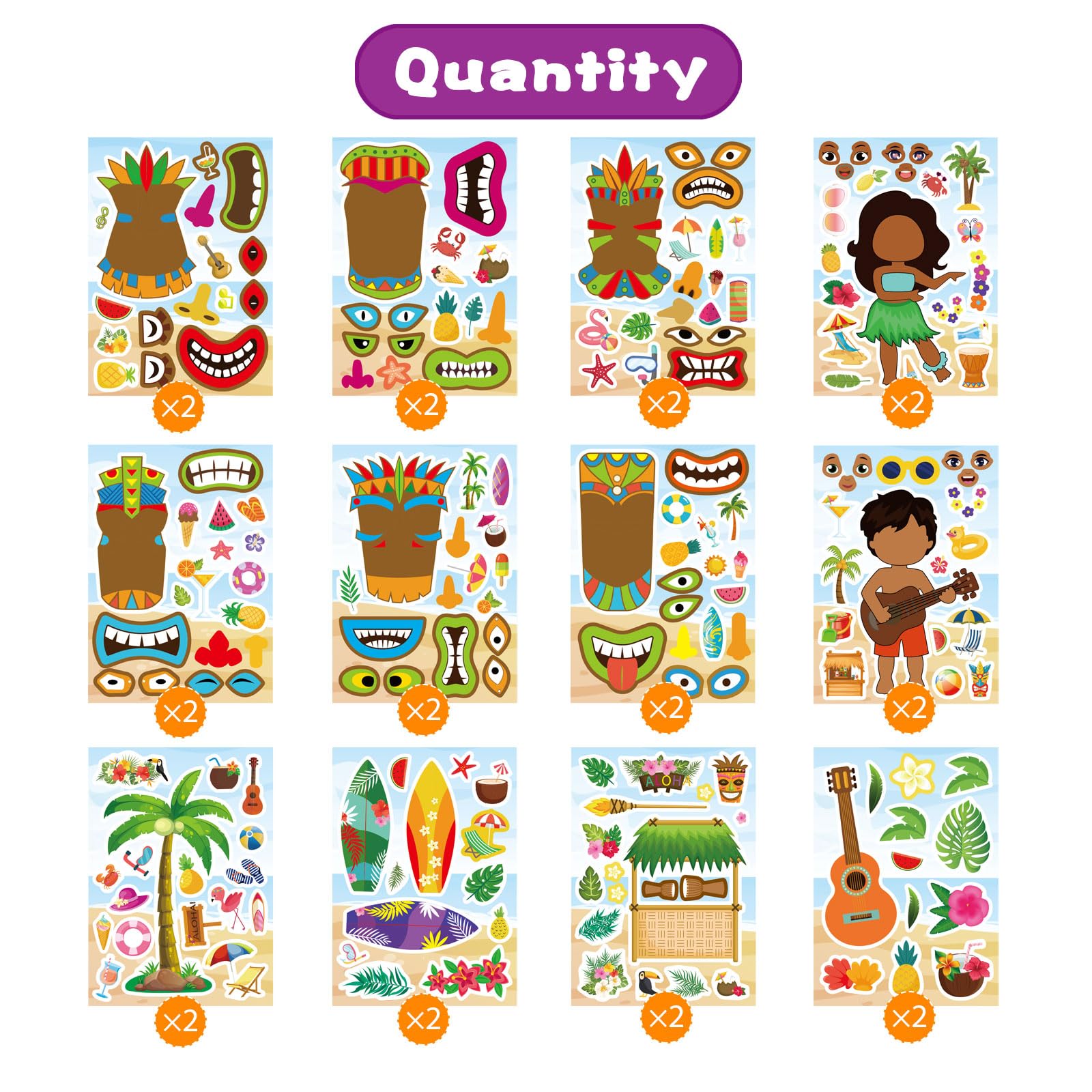 24 Sheets Summer Stickers, Hawaii Make A Face Sticker, Make Your Own Beach Tropical Cartoon Mix And Match Stickersaloha Tiki Tot