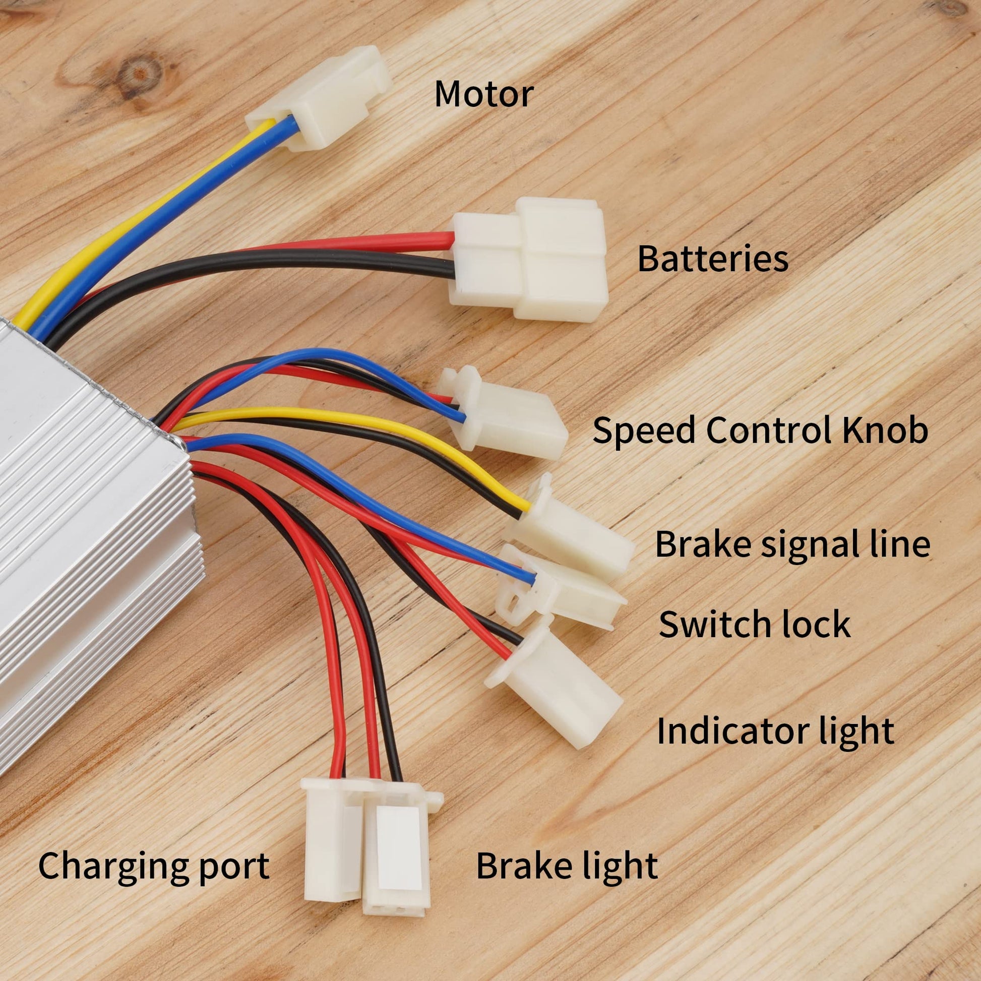 • Q: What types of connections does the motor speed controller have? A: The controller includes various wire interfaces for brake signals, battery connections, motor connections, and throttle controls, making installation straightforward with quick connectors.