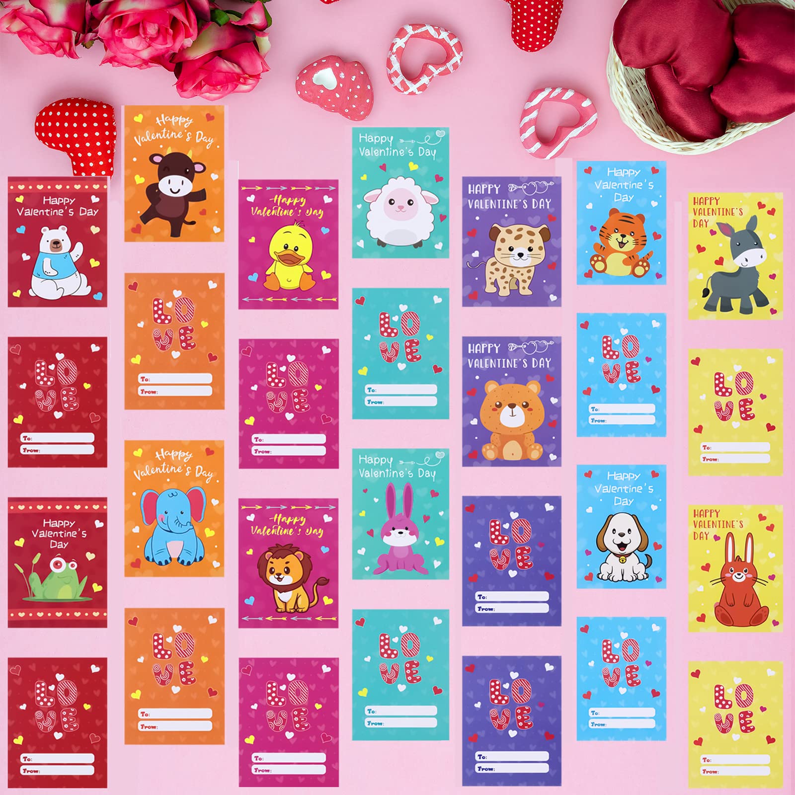 28 Pack Valentines Day Gift Cards for Kids with Mini Animal Plush Toys Keychains,Stuffed Animal for Students Classroom Exchange,