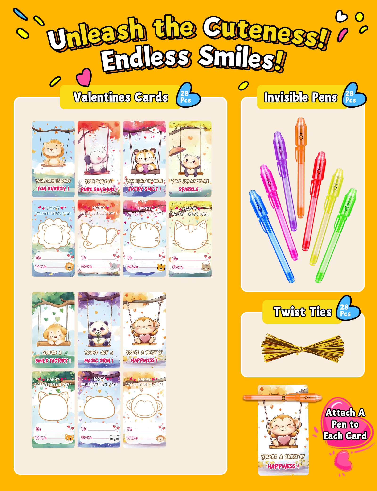 28 Pcs Valentines Day Cards for Kids School With Invisible Ink Pens, Valentines Day Gifts for Kids, Valentines Exchange Gifts fo