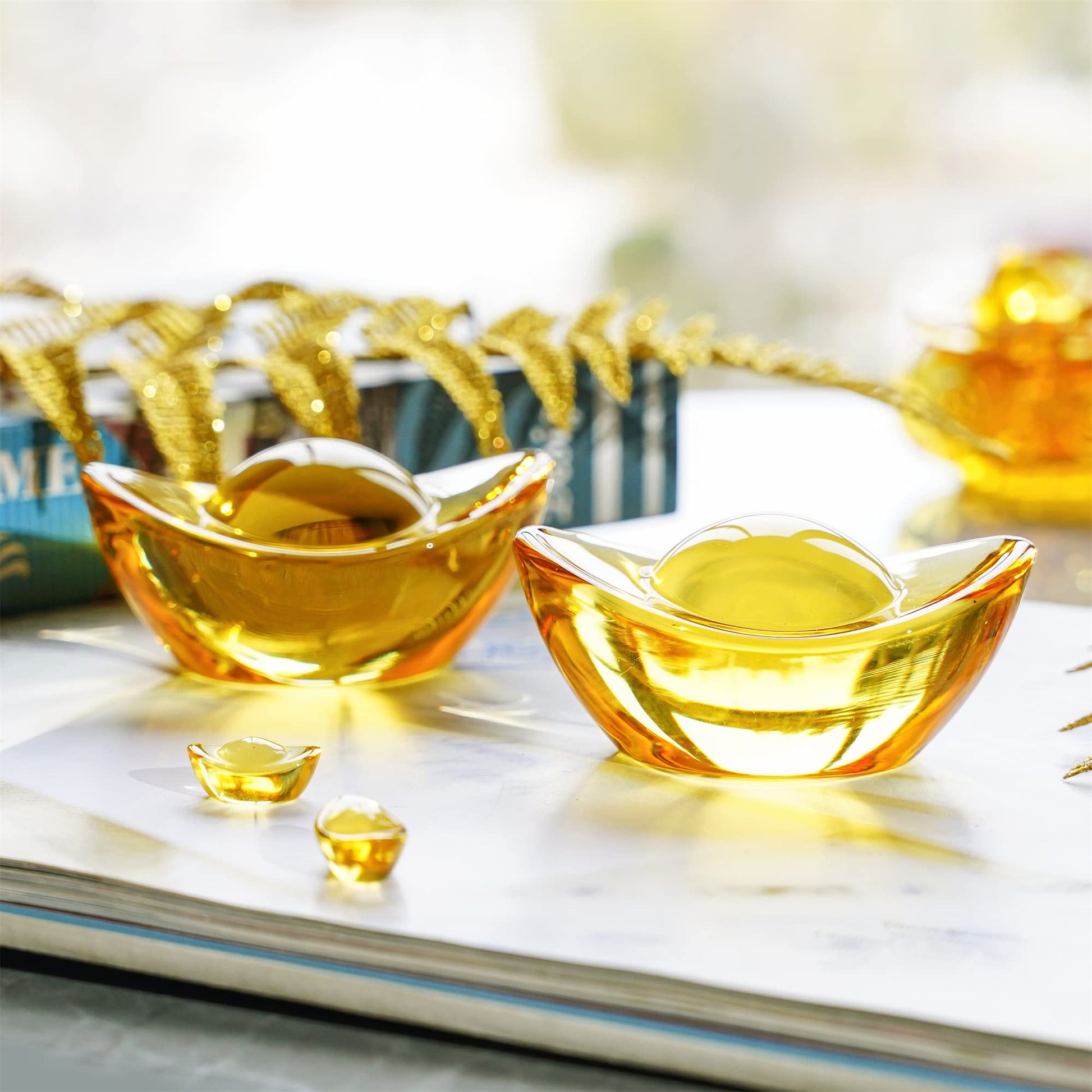 2Pcs Handmade Chinese Yellow Crystal Yuan Bao Figurine Collectibles Feng Shui Golden Ingot Statues Ornament For Wealth Luck,3Inch