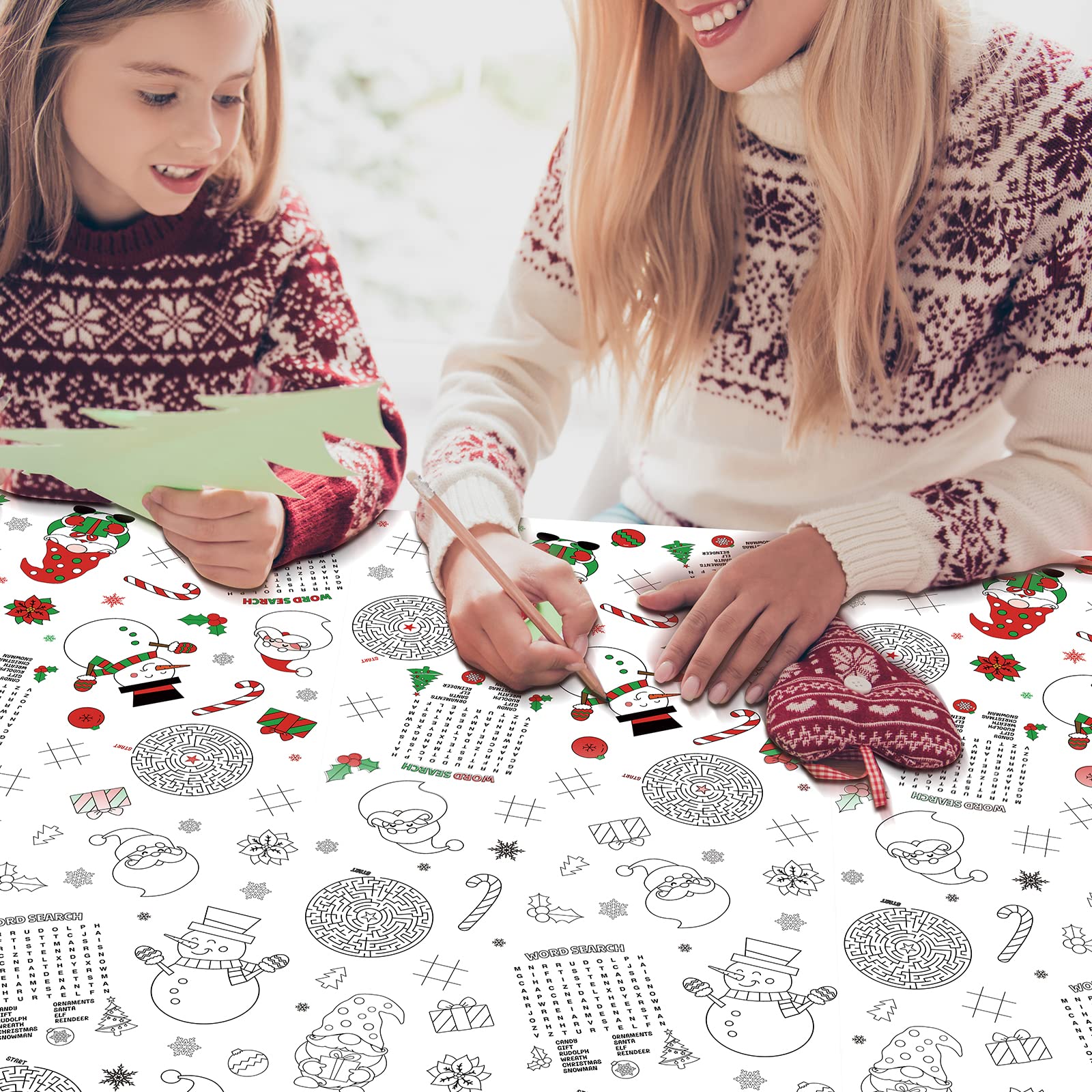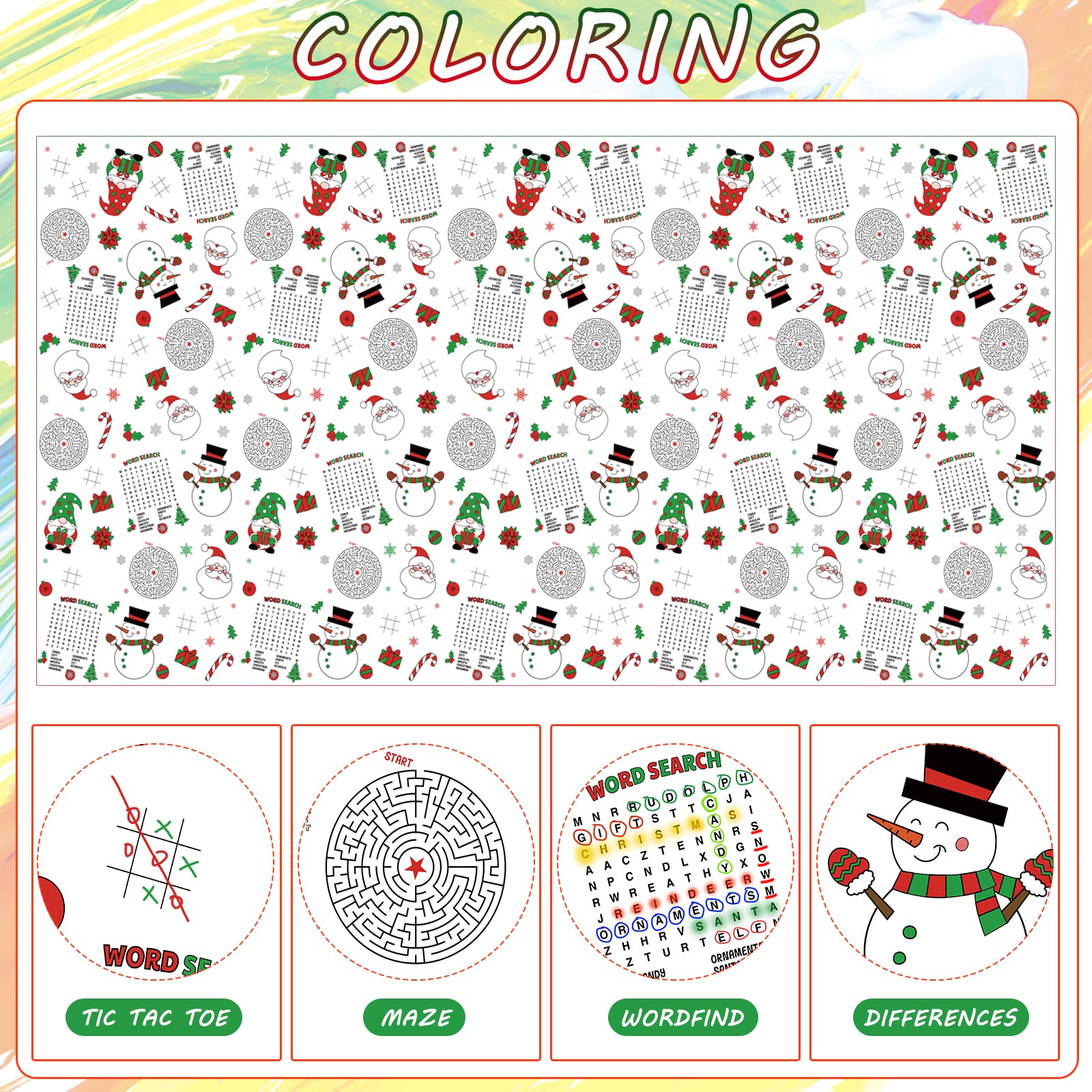 Features: Christmas Tablecloth Christmas Activity Paper Tablecloth Santa Claus Snowman Gnome Color-in Paper Disposable Rectangle Tablecover for Kids Christmas Winter Holiday Birthday Party Decoration 54X108inch Various applications: Our coloring activity Christmas table cover can be used as a kids family school classroom entertainment project, you will work together to complete the color-in game and use it in dinner, make it an event to remember with this unique will make your Christmas more memorable and meaningful Reliable to use: this Christmas activity tablecloth is made of thick paper, which is reliable, clearly printed, and not easy to break, tear off, or fade, providing you with a pleasant using experience Specifications: Material: thick paper Size: 108 x 54 inch/137x274cm Notes: Please allow slight size errors due to manual measurement. Please check the size carefully before ordering. There might be a little color differences due to the monitor, camera or other factors, please refer to the physical items.