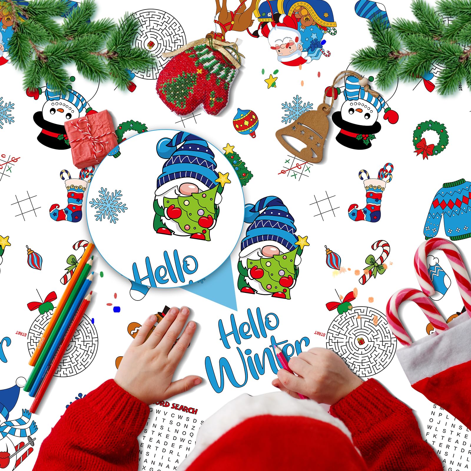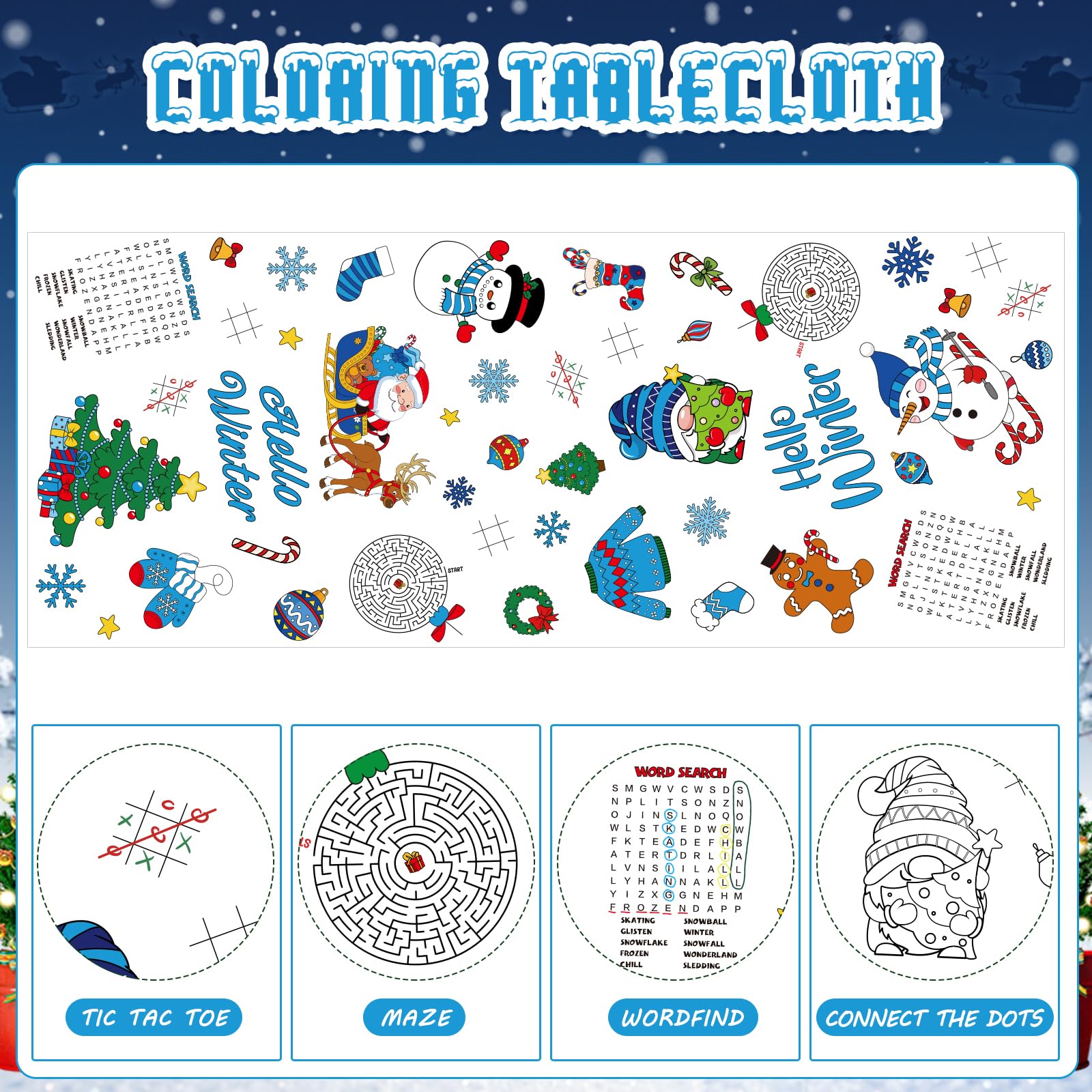 Winter Paper Tablecloth Party Decorations Features: Fun Winter Christmas Activities for Kids The tablecloth is versatile and can be used as a fun winter Christmas activity for kids, whether in school classrooms or as a family DIY project. Its an excellent way to create unforgettable and joyful memories with your children. After coloring, it can be put to practical use as a tablecloth. Wide Applications: These winter Christmas kids coloring tablecloth decorations are perfectly suited for a range of events, including winter gatherings, Christmas celebrations, and other themed parties. Their presence will undoubtedly contribute to the creation of lasting and cherished memories for you, your friends, and your family. Specifications: Color: As shown in pictures Size: Approx 54 x 108 inches Notes: Manual measurement, please allow slight errors in size. The color may have a slight difference due to different screen displays. Please stay away from fire.