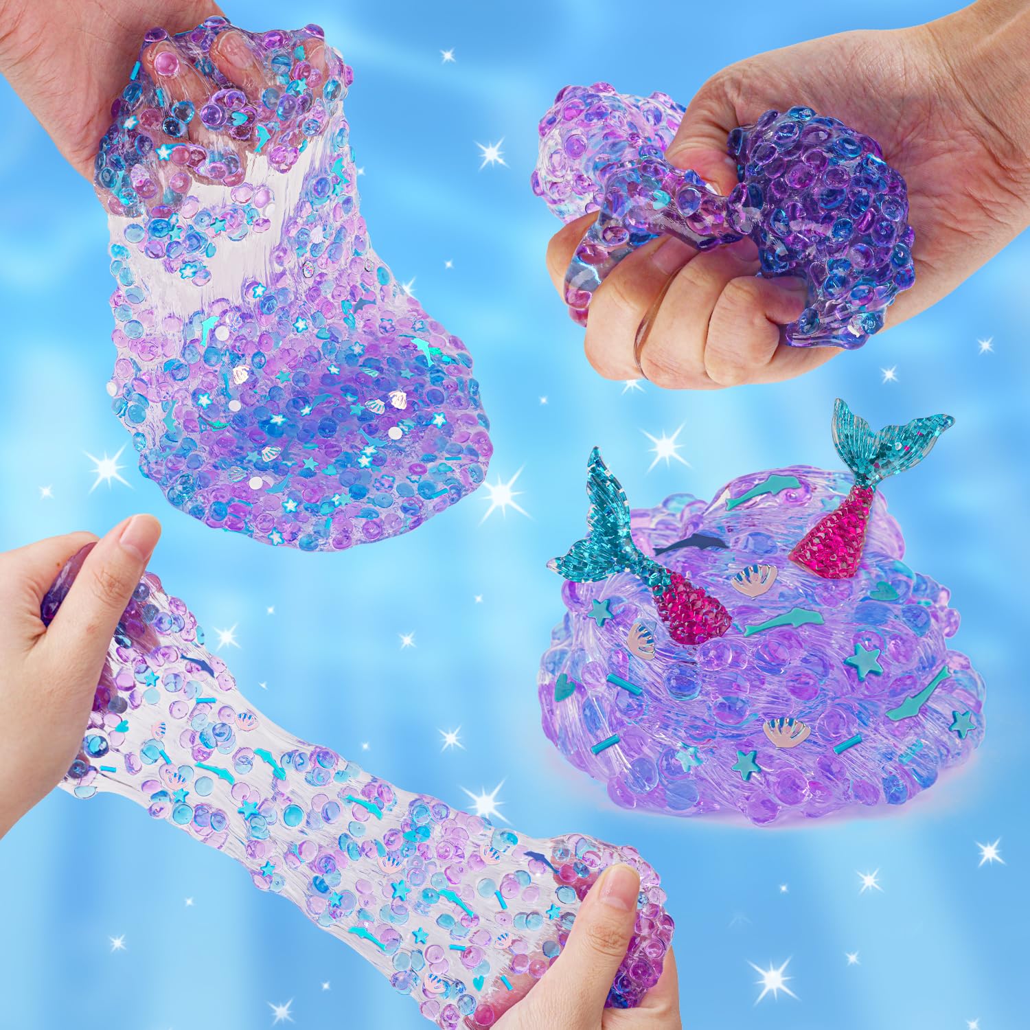 Introducing the Okaybee Clear Slime Bucket - a must-have for all slime enthusiasts! Our slime is perfect for kids and adults alike, offering a fun and satisfying sensory experience. To enhance the fun, we have included 9 packs awesome add-ins with our Mermaid Slime Kit: Slime Charms, Plush Balls, Colorful Pearls, Glimmer Tubes, Suger Sprinkles, Suger Paper, Soft Slices, Ice Cube Slices . Let your imagination run wild as you mix and match different add-ins to create your own one-of-a-kind slime masterpieces. The Okaybee Green Clear Slime is made with top-quality ingredients to provide the best slime experience possible. Watch as the slime stretches, squishes, and oozes through your fingers, providing endless hours of entertainment. One of the key features of our slime is its incredible texture. It is soft and stretchy, allowing for easy manipulation and creating the perfect consistency for slime lovers. You will experience a unique, jelly-like sensation that is guaranteed to delight. Whether you are a beginner or an experienced slime enthusiast, this bucket of slime has everything you need to unleash your creativity. With the Okaybee Blue Clear Slime Bucket, you will have hours of fun and relaxation. So why wait? Get your hands on this amazing Mermaid Slime Kit and create your own magical slime world today!