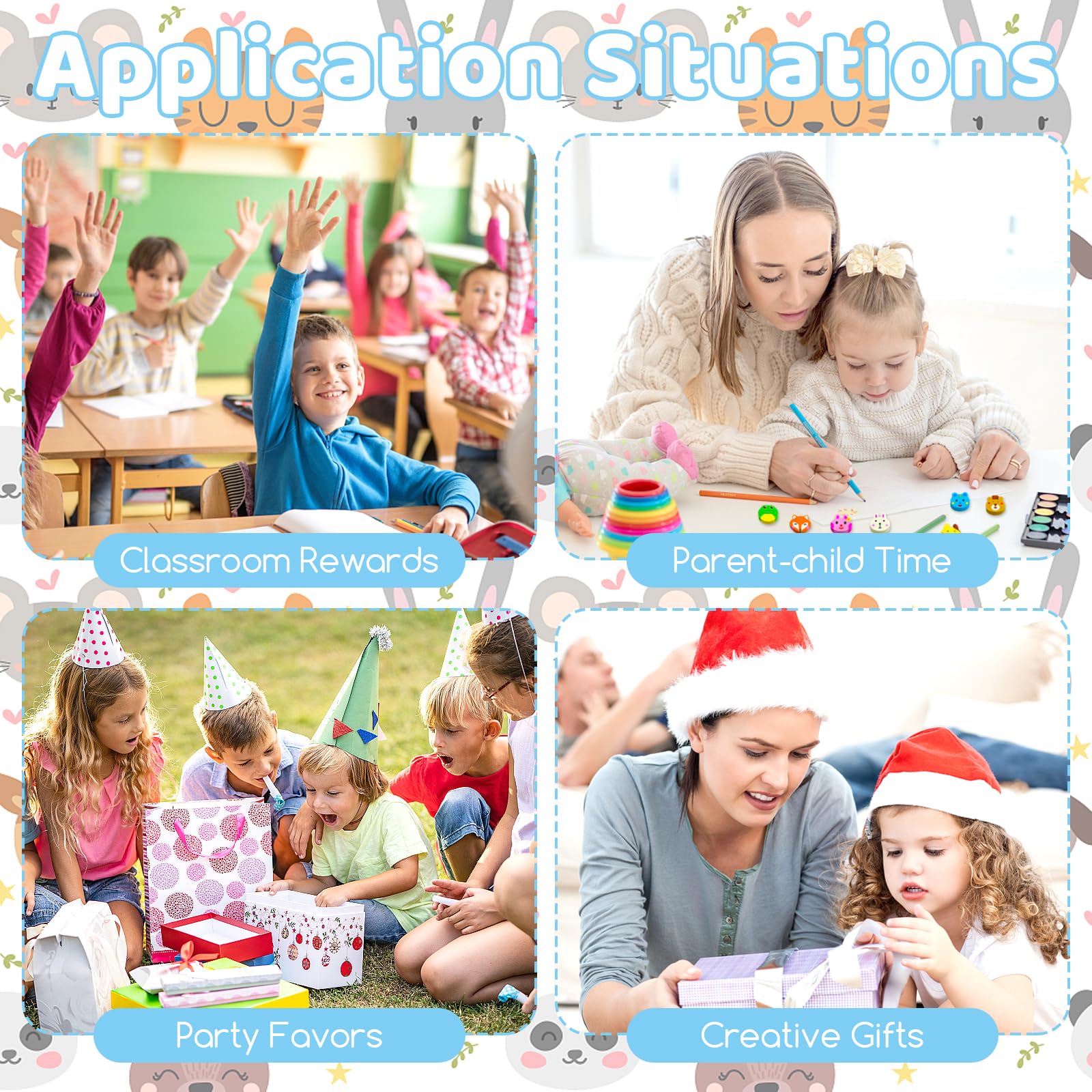 - Q: What themes are available in the mini erasers assortment? A: The mini erasers assortment includes three different themes: marine organisms, delicious cakes, and Christmas festival. Each theme features a variety of cute designs.