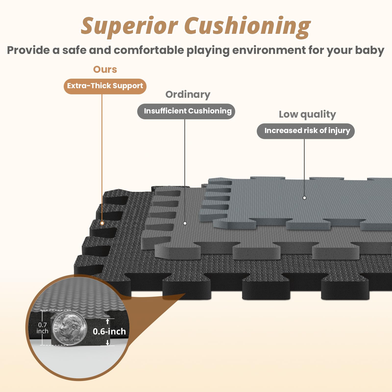 Thick Foam Mat: These 0.6-inch extra-thick foam floor tiles for kids provide a safe area for kids to play, preventing them from bumping into things while playing. | Easy to Assemble: The interlocking design makes the puzzle mat easy to assemble and disassemble, while the waterproof design also makes the mat easy to clean. | 36 Square Feet: The baby floor play mat is assembled to be 72*72 inches, providing ample space for the baby to play. | Premium Material: Our baby play foam mat is made of EVA foam, BPA Free, creating a safe and healthy playing space for children of different ages | Multiple Uses: Our foam mat is suitable for different types of scenes and activities. It can be used as a play mat for Kids Gym, Nursery, Playroom. The mat is also suitable for outdoor activities such as camping or picnics.