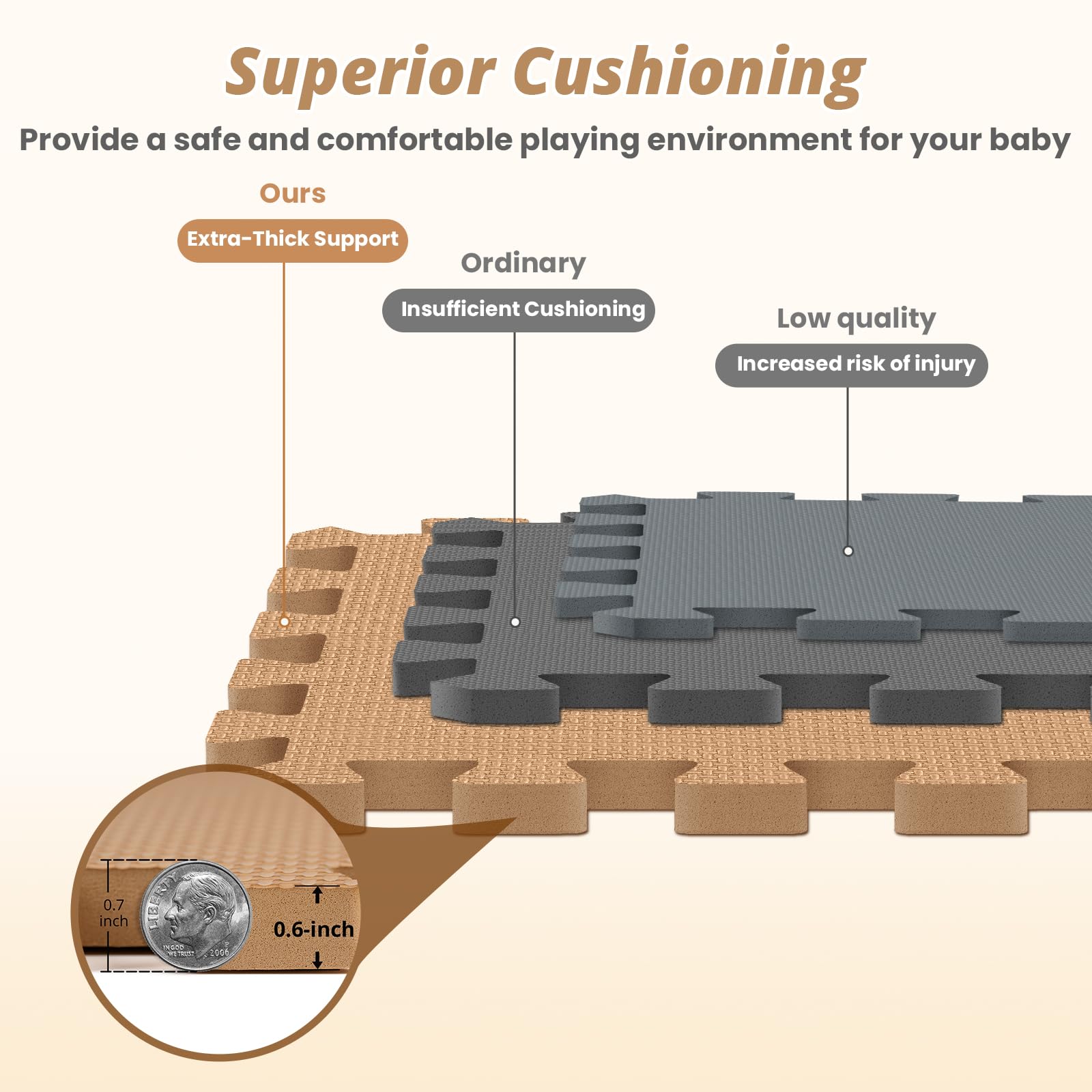 - Q: How thick is the foam mat? A: The foam mat is zero point six inches thick. This extra thickness provides cushioning and safety for children while they play.