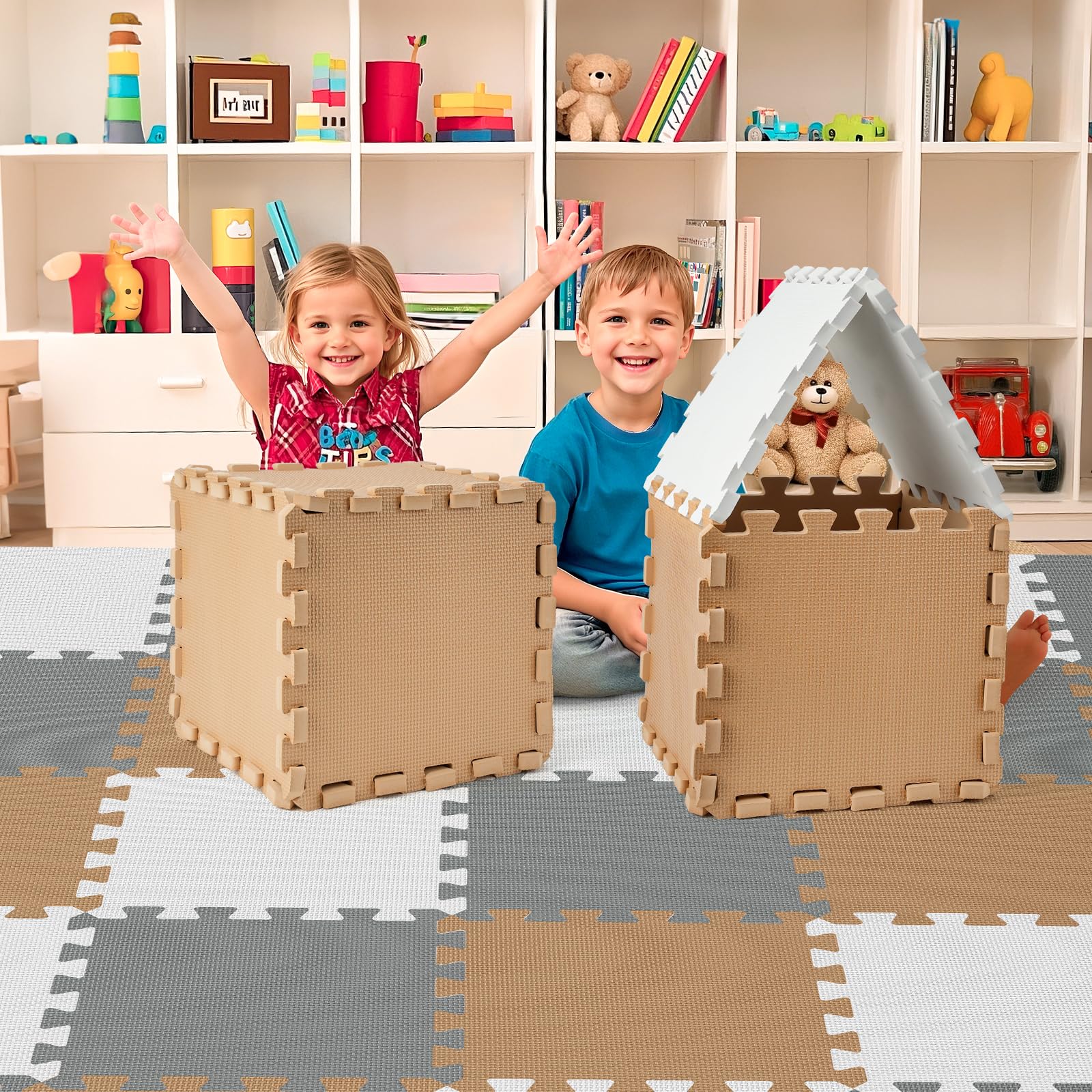 - Q: What colors does the play mat come in? A: The play mat features a grey, white, and brown color scheme. This neutral palette blends well with various home décors.