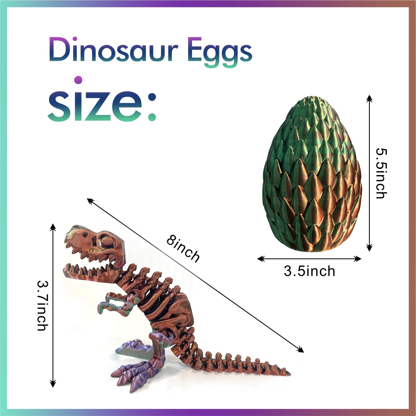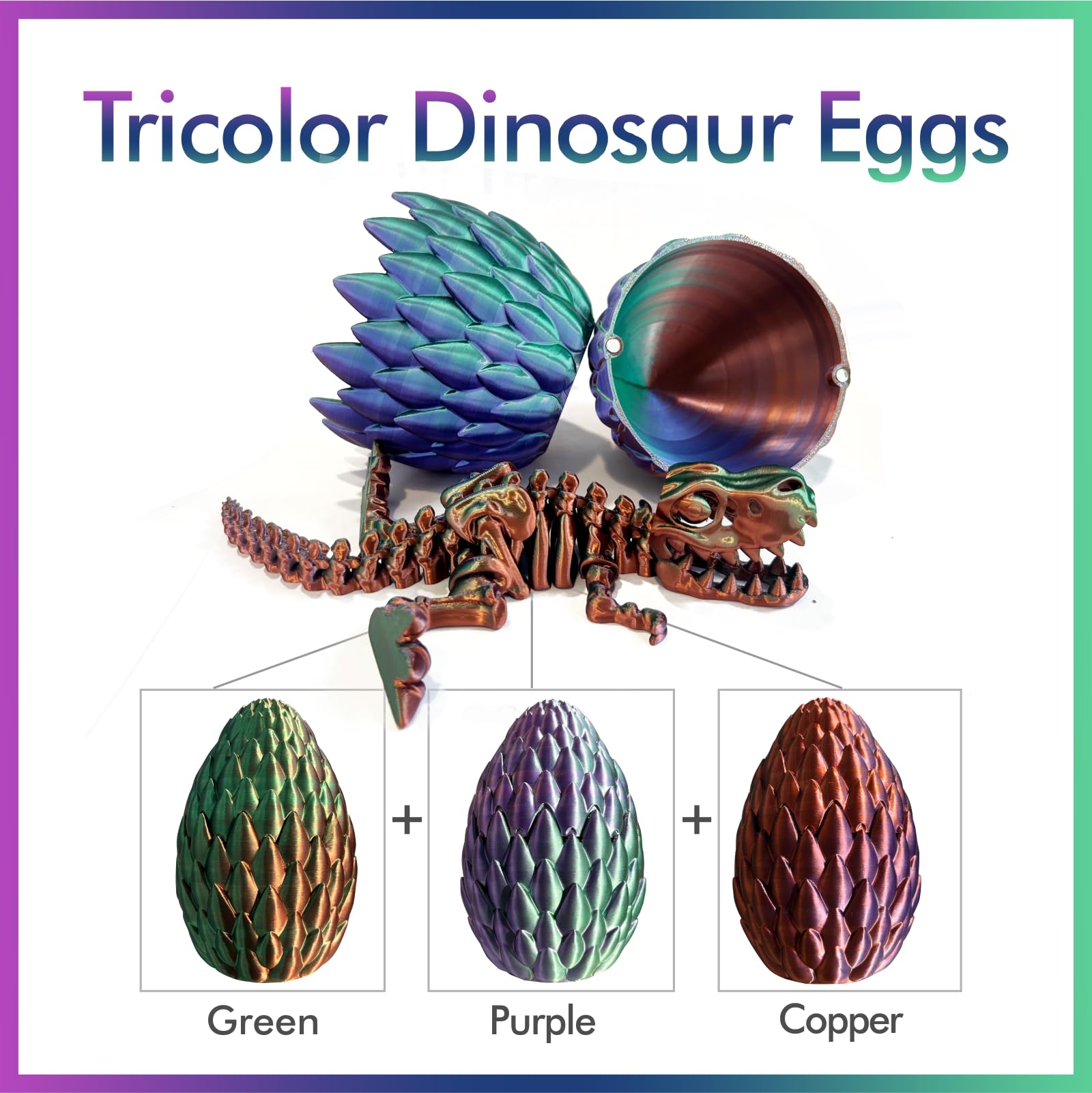 3D Printed Dinosaur Toy, 3D Printed Dinosaur Egg With Articulated Tyrannosaurus Rex, Mystery Crystal Dinosaur Flexible Rexi Toys With Bone, Articulated Fidget Dragon For Autism (Green-Purple-Copper)