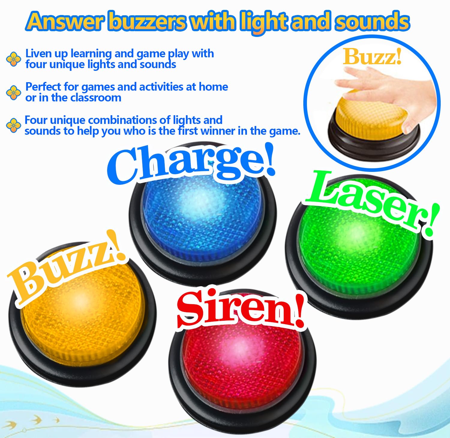 - Q: How do I activate the lights and sounds on the buzzers? A: To activate the lights and sounds on each buzzer, simply press the top button. This easy-to-use feature allows both kids and adults to participate in games effortlessly.