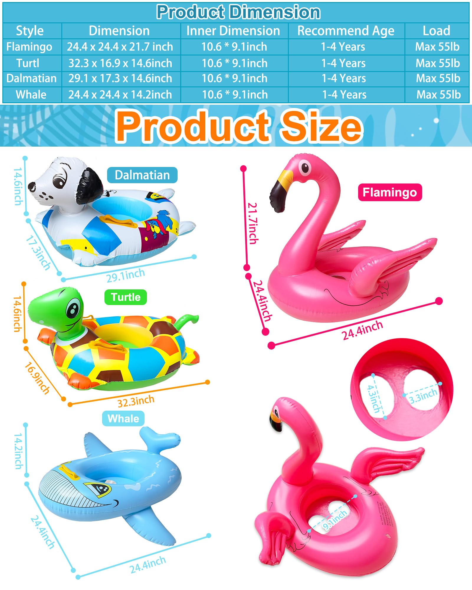 ? Specification ?Flamingo Dimensions: 24.4'' x 24.4'' x 21.7''Inner diameter: L 10.6 ''x W 9.1''Leg holes: L 4.3'' x W 3.3''Dalmatian Dimensions: 29.1'' x 17.3'' x 14.6''Inside diameter: L 10.6 ''x W 9.1''Leg holes: L 4.3'' x W 3.3''Turtle Dimensions: 32.3'' x 16.9'' x 14.6''Inside diameter: L 10.6 ''x W 9.1''Leg holes: L 4.3'' x W 3.3''Whale Dimensions :24.4'' x 24.4'' x 14.2''Inside diameter: L 10.6 ''x W 9.1''Leg holes: L 4.3'' x W 3.3''Load: Maximum 55lbMaterial: High quality thick PVCColor: Colorful and VibrantRecommend Ages: 1-4 YearsUsage scenarios: Water park, summer outdoor party, beach, lake, river, garden pool, beach, Hawaiian Pool party, Water carnival, summer event, holiday birthday party? Package includes ?Flamingo Pool Float *1Dalmatian Pool Float *1Turtle Pool Float *1Whale Pool Float *1Patch *1