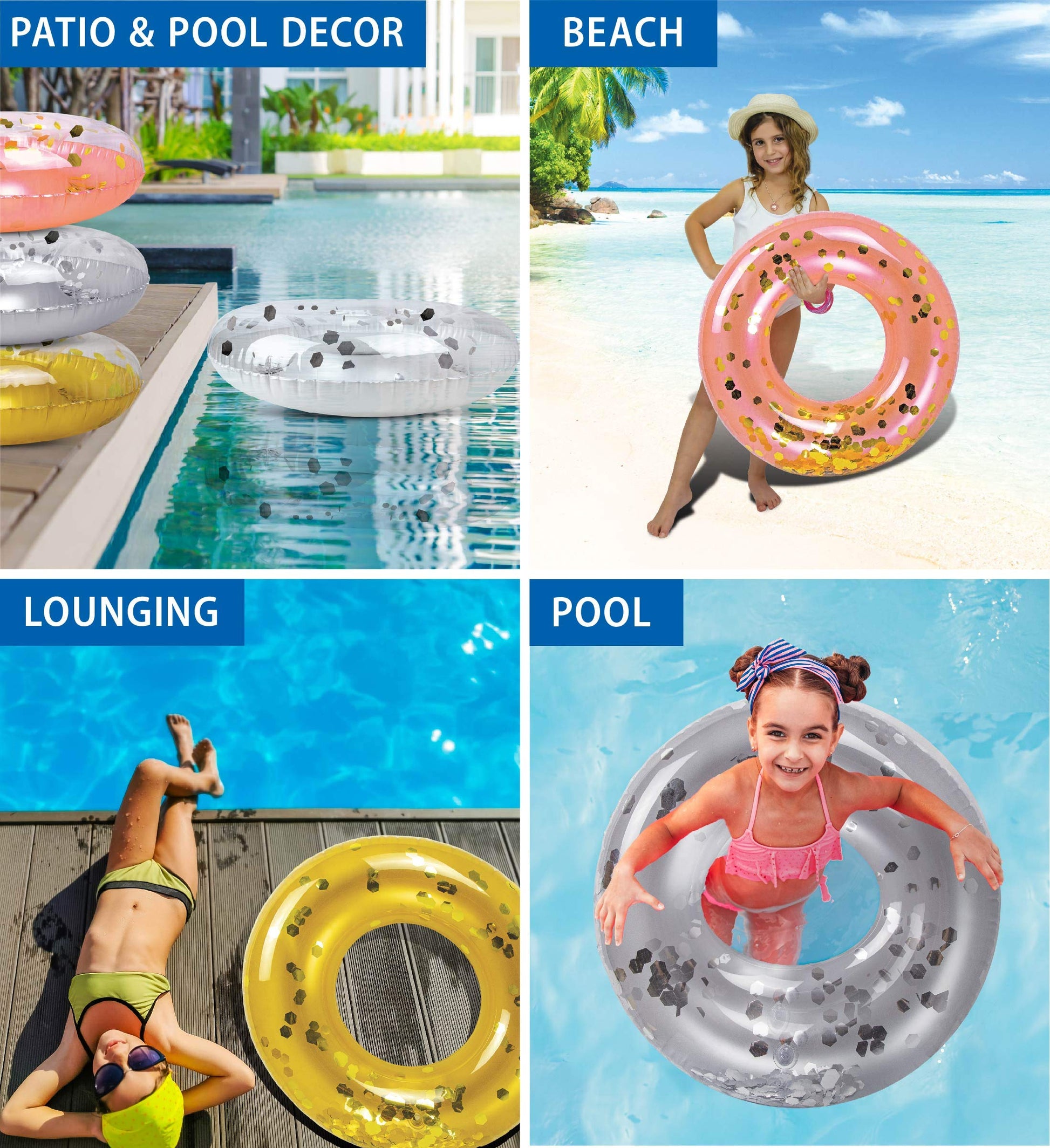 4-Pack Kids Inflatable Pool Floats - Sparkly Confetti-Filled Glitter Pool Float Rings, Cute Pool Floats In Pearl, Silver, Rose Gold, And Gold; Floating Tube Swim Rings For Pool, Beach, Lake - 23 Inch
