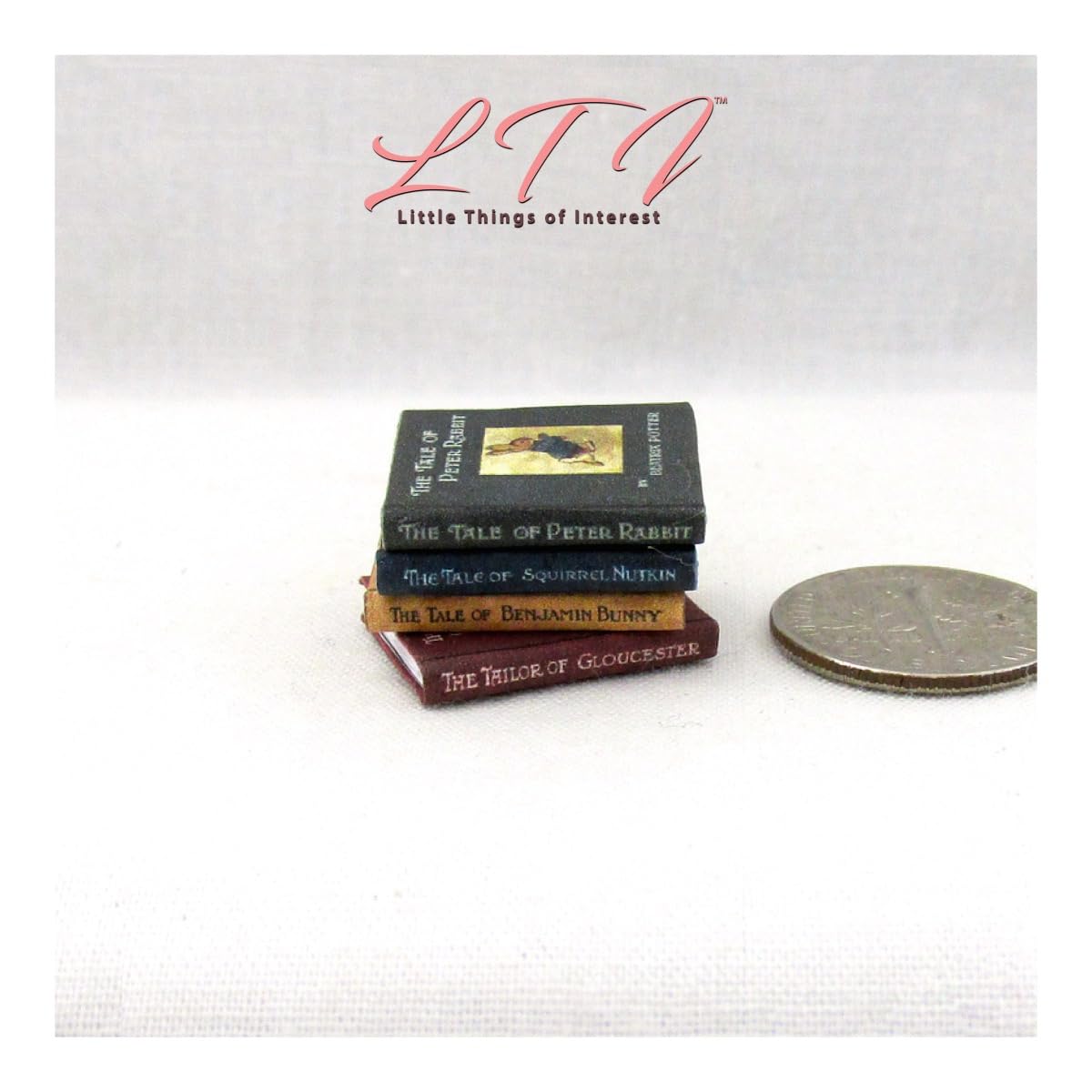 Set includes 4 Beatrix Potter books in 1:12 scale, each has 12 readable pages with full color illustrations. They measure approximately 11/16 of an inch high by 1/2 of an inch wide. They will look GREAT open or closed. Set includes The Tale of Petter Rabbit, The Tale of Squirrel Nutkin, The Tailor of Gloucester and The Tale of Benjamin Bunny.
