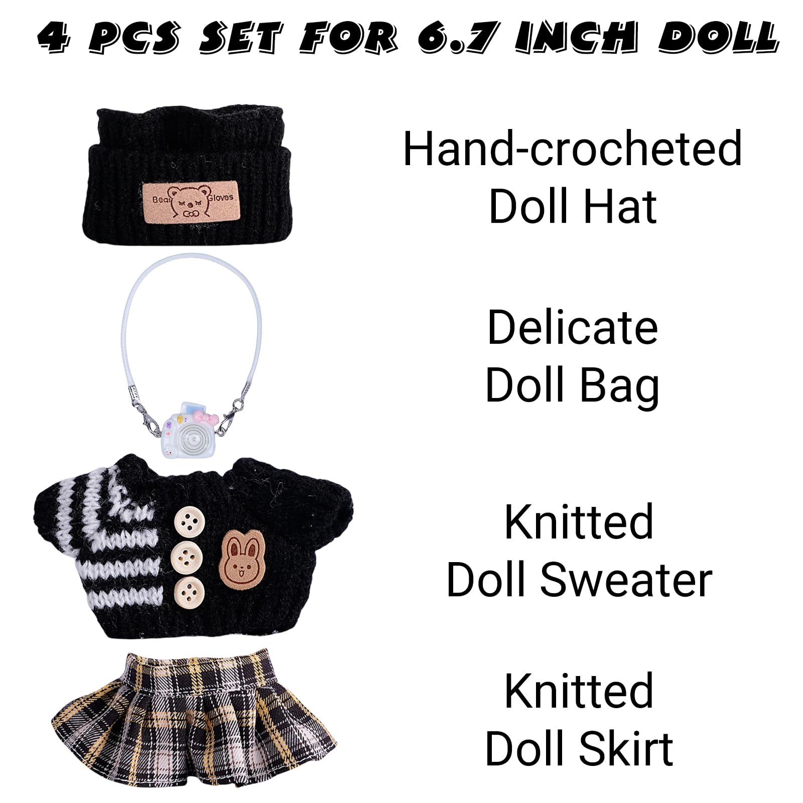 4 Piece Handcrafted Crochet Doll Clothes for 17cm/15cm Labubu Dolls (No Doll) Cute and enhanced Outfits with Accessories Hand Crocheted Hat Sweaters Skirt Bag (Black) AK051