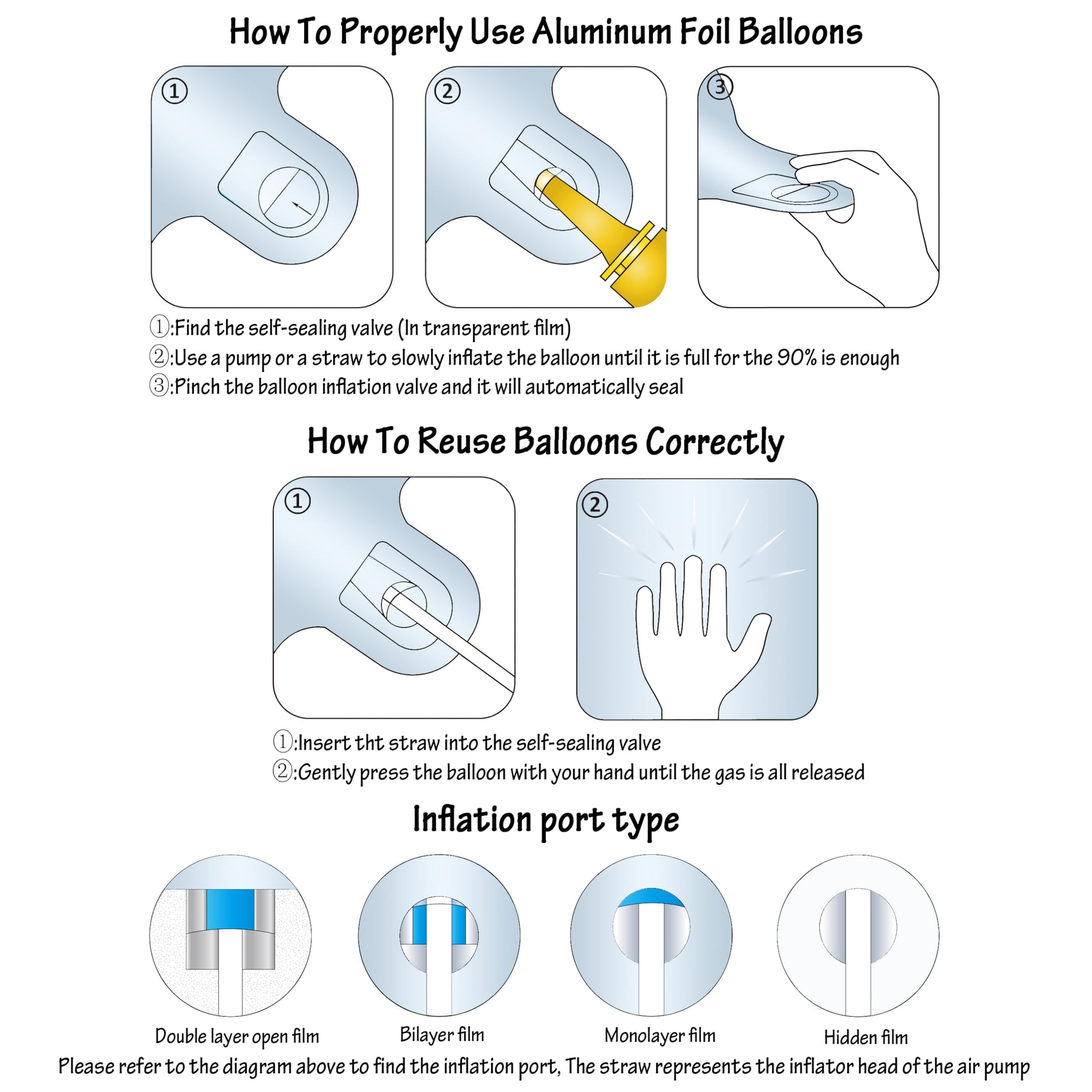 • Q: Can I inflate the balloons with air instead of helium? A: Yes, the balloons can be inflated using air with a straw or a handheld pump, but they will not float if inflated with air.