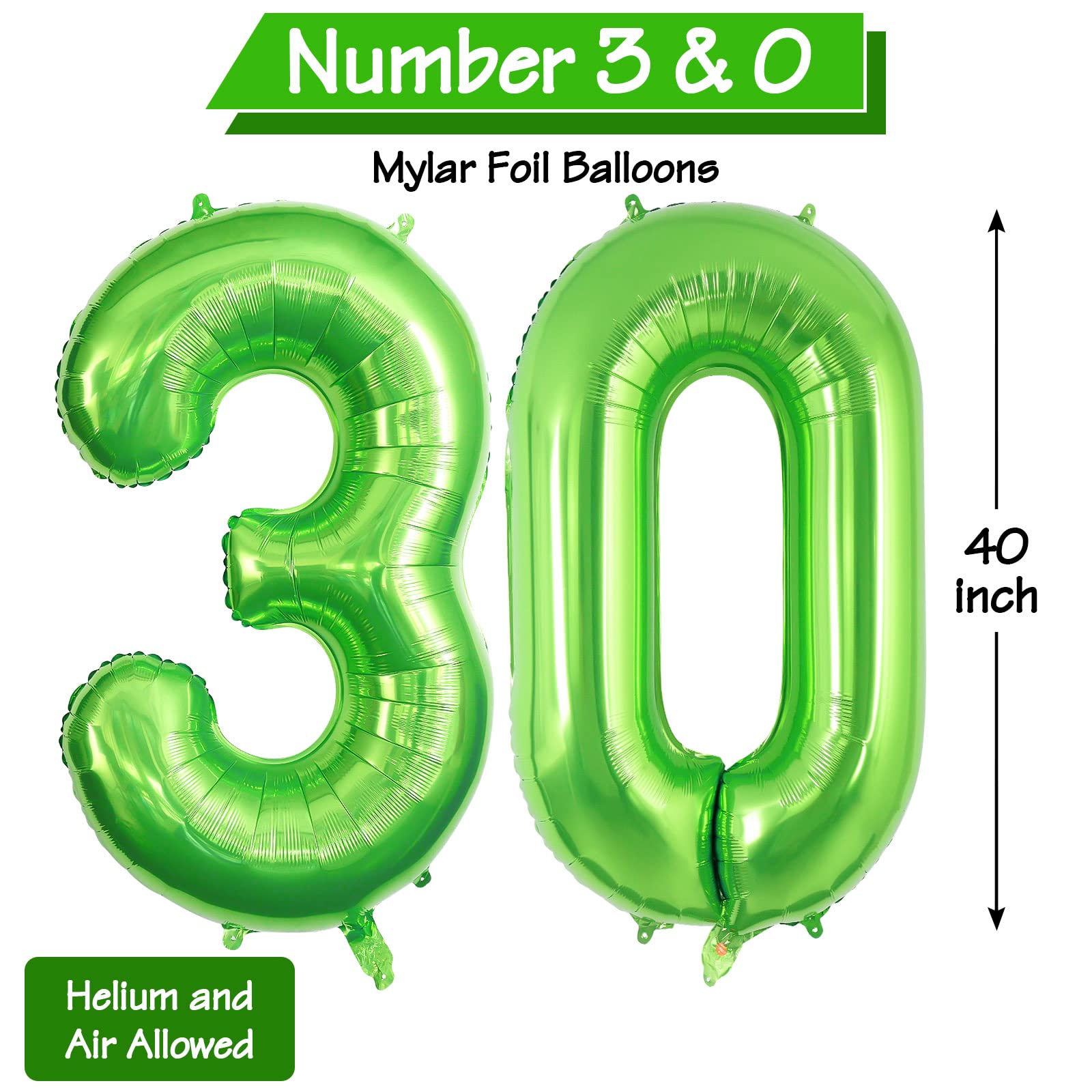- Q: What are the dimensions of the 40 Inch Green 30 Number Balloons? A: The 40 Inch Green 30 Number Balloons consist of two pieces that represent the numbers 3 and 0, each measuring 40 inches in height.