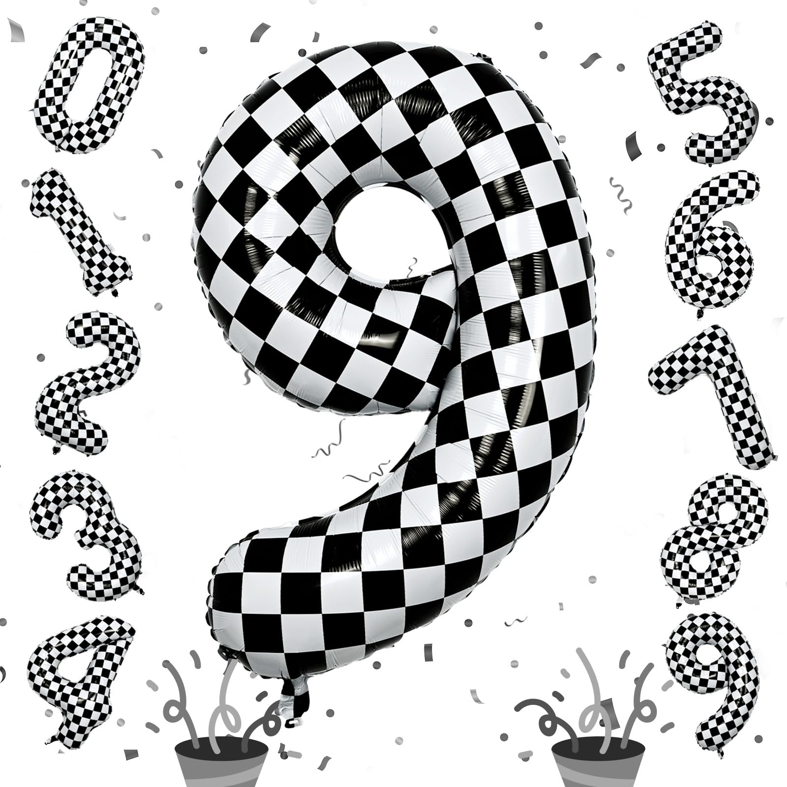 - Q: What are the dimensions of the Checkered Number 9 Balloons? A: The Checkered Number 9 Balloons measure 40 inches in height, making them a striking decoration for any birthday party or celebration.