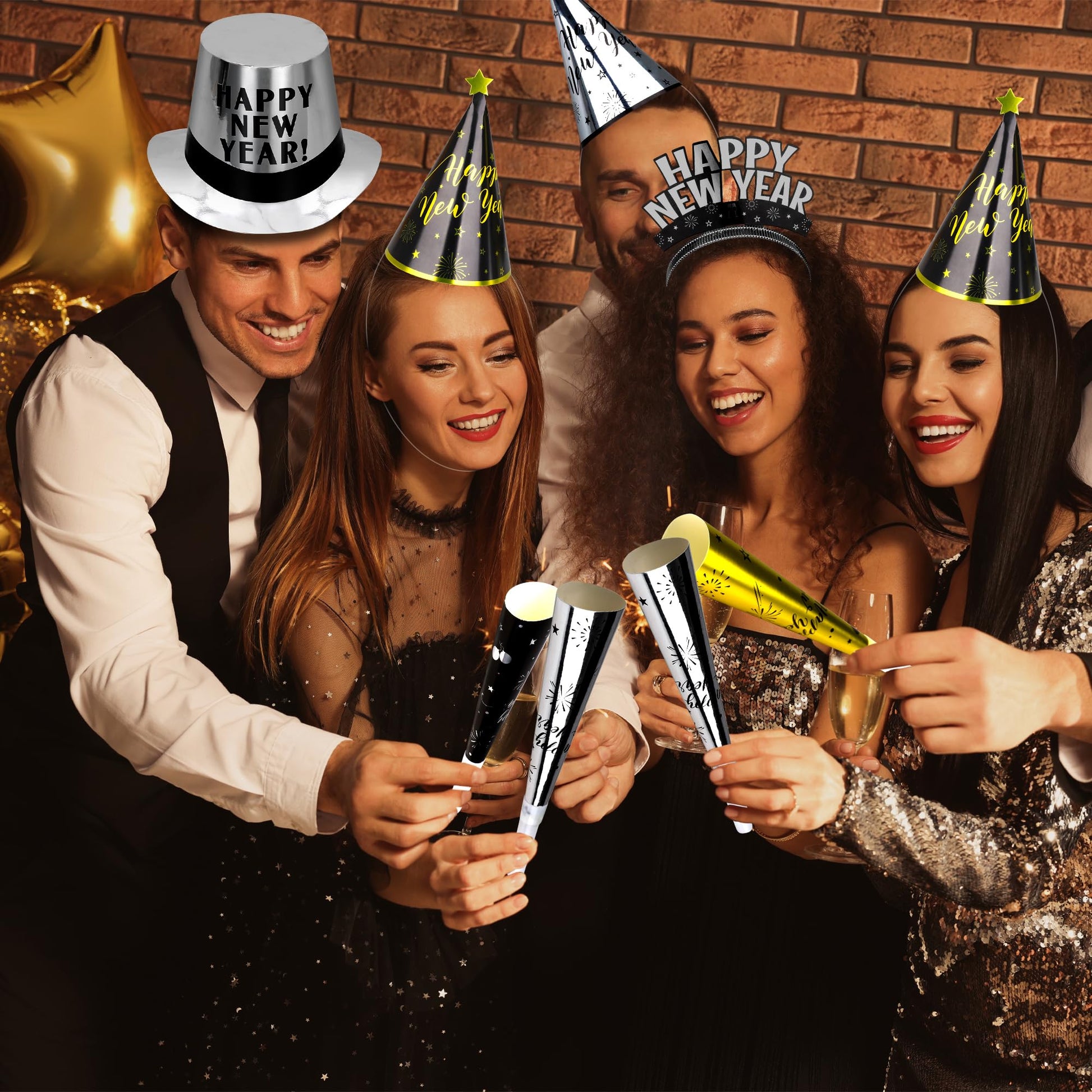 Cheers to New Beginnings with Our Stylish New Year Eve Party Favors! What Makes our Products Unique? Suitable for most parties Distinctive Happy New Year 2025 motif Three classic colors are available Includes a full assortment of New Years party items Whats Included: 6 Top Hats 7 Cone Hats 7 Headbands 10 Party Horns 10 Noisemakers Specifications: Color: Gold Silver Black Material: Plastic & Cardboard
