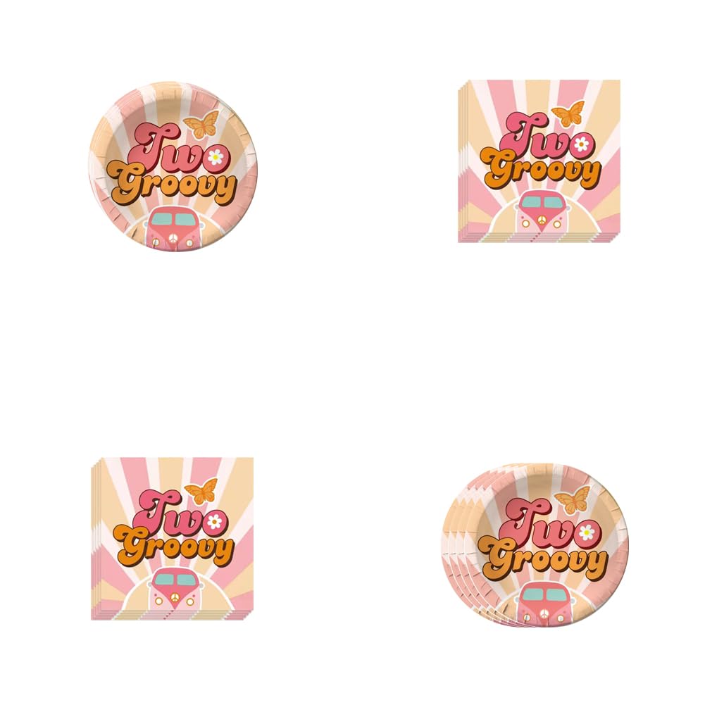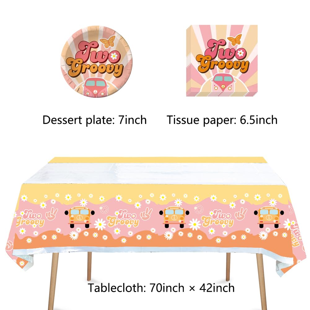- Q: What is included in the 41pcs Two Groovy Party Supplies set? A: The set includes 20 dessert plates (7 inches), 20 napkins (6.5 inches), and 1 banquet table cover (70 inches x 42 inches), making it perfect for a retro hippie-themed birthday party.
