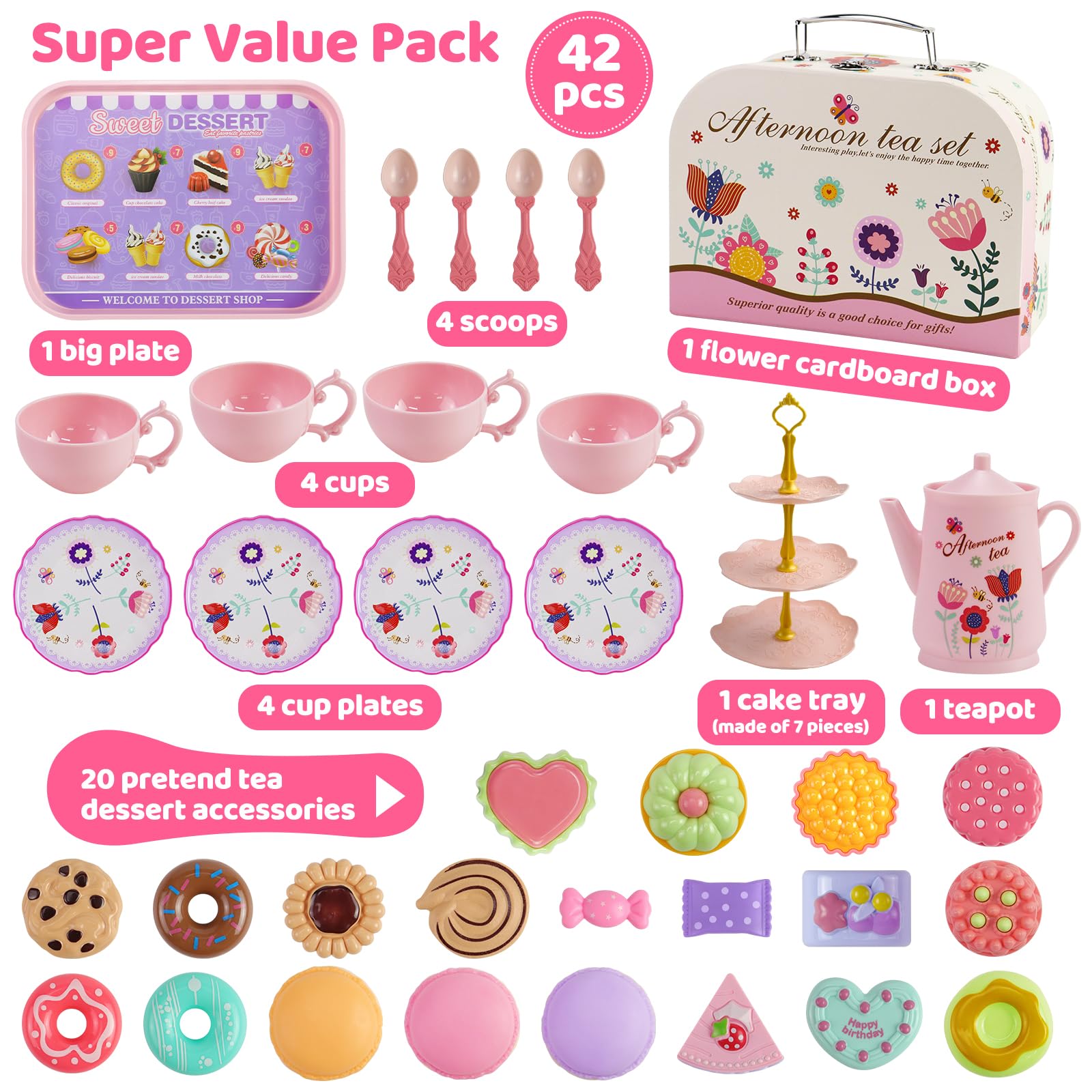 42 Pcs Flower Kids Tea Party Set with Carrying Case & Sweet Treats Playset - Pretend Toy Tin Tea Set for Little Girls - Princess