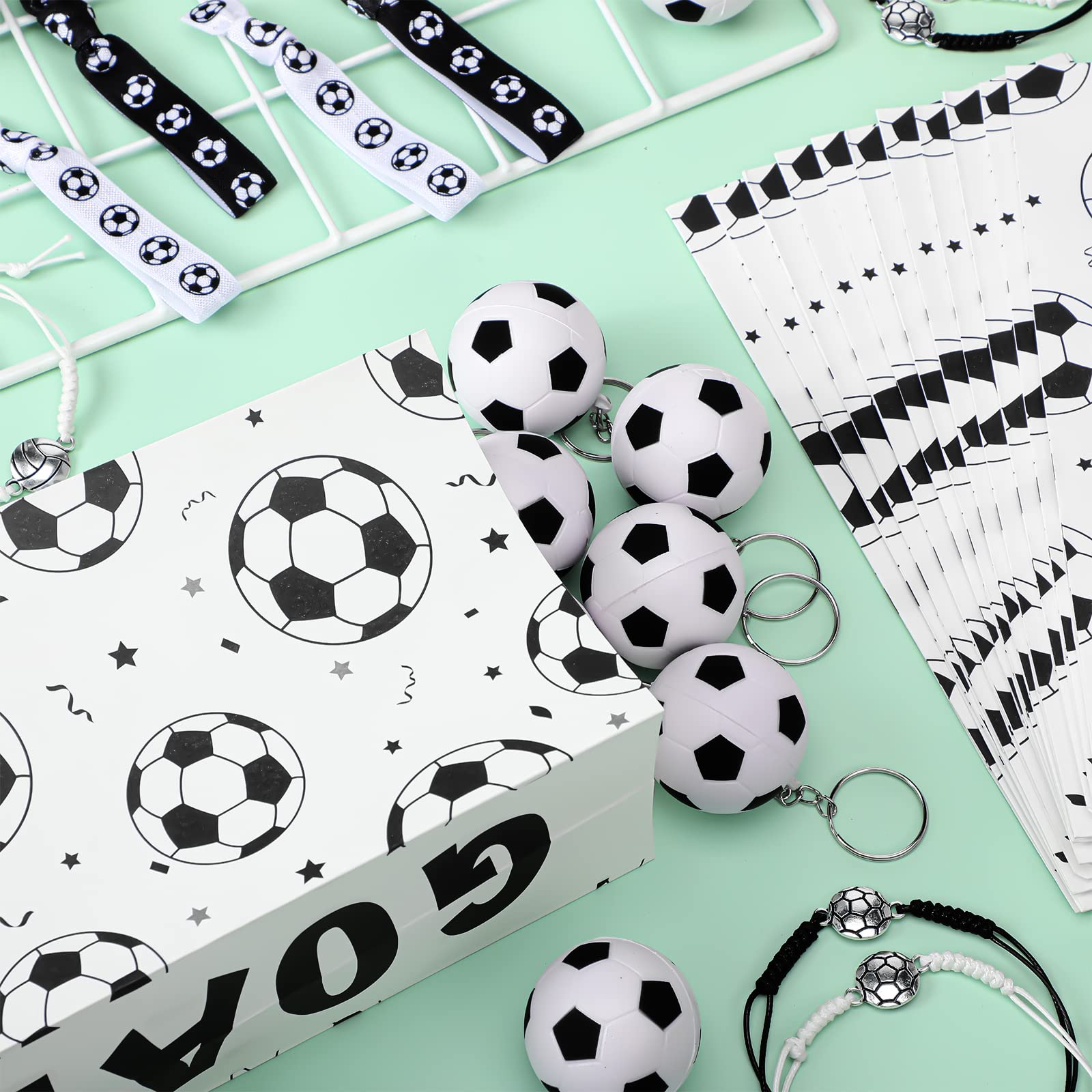 Features:Funny football style gifts: These soccer birthday party supplies can be applied as adorable and practical gifts for teachers. Apart from that, they can also be served as home, business, or office supplies, party prizes or party bag fillers at sports party, football party, birthday party, Christmas, Halloween, stage props, etc.Hold a grand party for those football fans:These soccer team party supplies are in line with the boys and girlss favors, especially those football game fans, so come to throw a soccer themed party and welcome the exciting moment of scoring together with your family members and friends.Specifications:Material: PU, fabric, white craft paperColor: mainly black and whiteSize: as shown in the picturePackage includes:12 x Soccer paper bags 12 x Soccer keychains12 x Football headbands12 x Soccer braceletsNotes:Manual measurement, please allow slight errors on size.The color may exist a slight difference due to different screen displays.Choking risk may exist, please keep away from boys and girls under 3 years old.