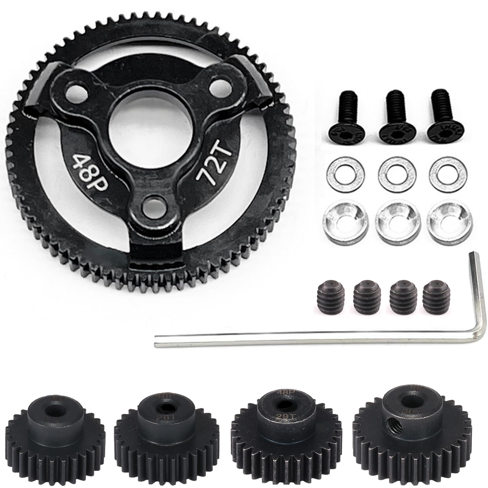 • Q: How do I install the 48P 72T Spur Gear and pinions? A: Installation is straightforward as these gears are designed for direct replacement. The package includes a hex key, screws, and spacers to securely lock the gear in place.