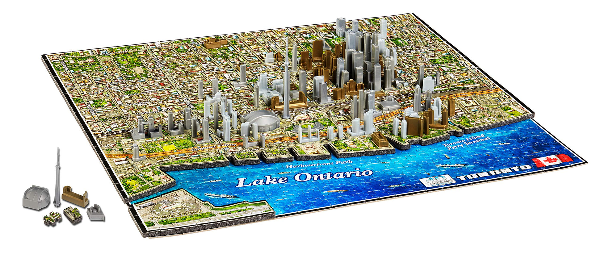 Product Description4D Toronto Cityscape Time PuzzleFrom the Manufacturer4D Cityscape recreates world famout City skylines not only in three dimensions (using scale-model buildings), but also along the axis of fourth dimension time, spanning over 100 years of its architectural history. The puzzle includes many detailed plastic replicas that depict the city as it appeared as far back as 1800 through to the present and future. Each puzzle includes famous monuments, buildings, skyscrapers, bridges, and more.The streets glow in the dark, emphasizing the city’s glow. Includes a Time Poster that includes a history of the city. The online educational feature includes more than 2000 facts. Ages 8 and up.