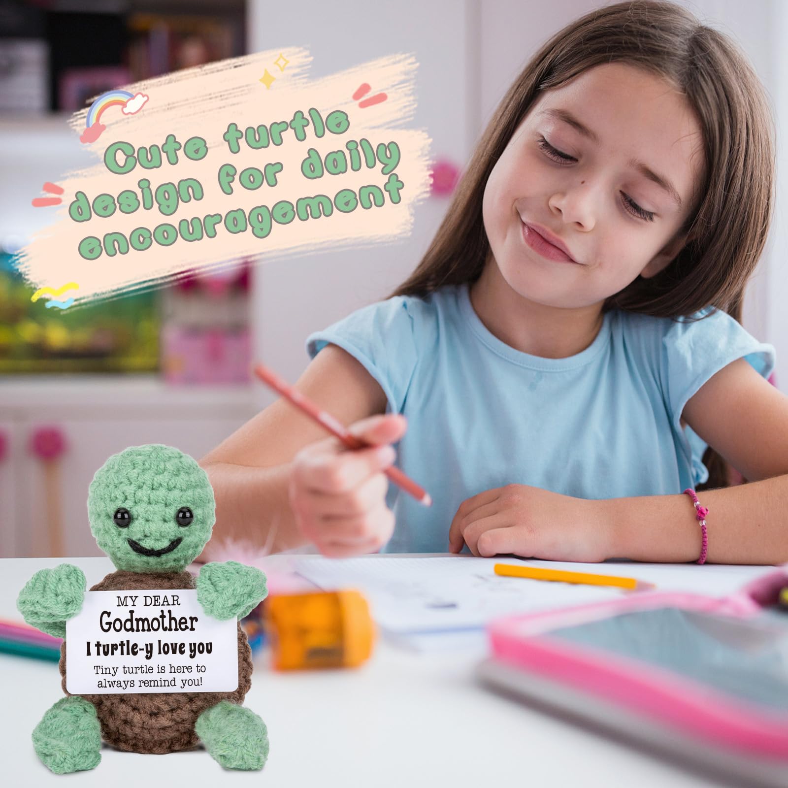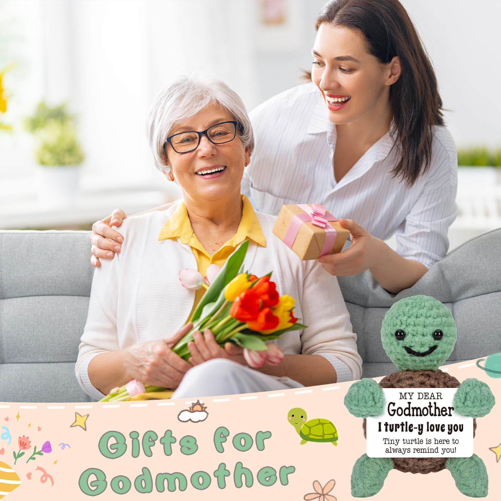 I TURTLE-Y LOVE YOU GODMOTHER TURTLE Size: 3.5 x 2.3 x 1.4 inches Material:Knitting wool yarn Production process: Handmade crochet USE: (1) Godmother Gifts or Decor (2) Birthday, Christmas, White Elephant, New Year, Mothers Day