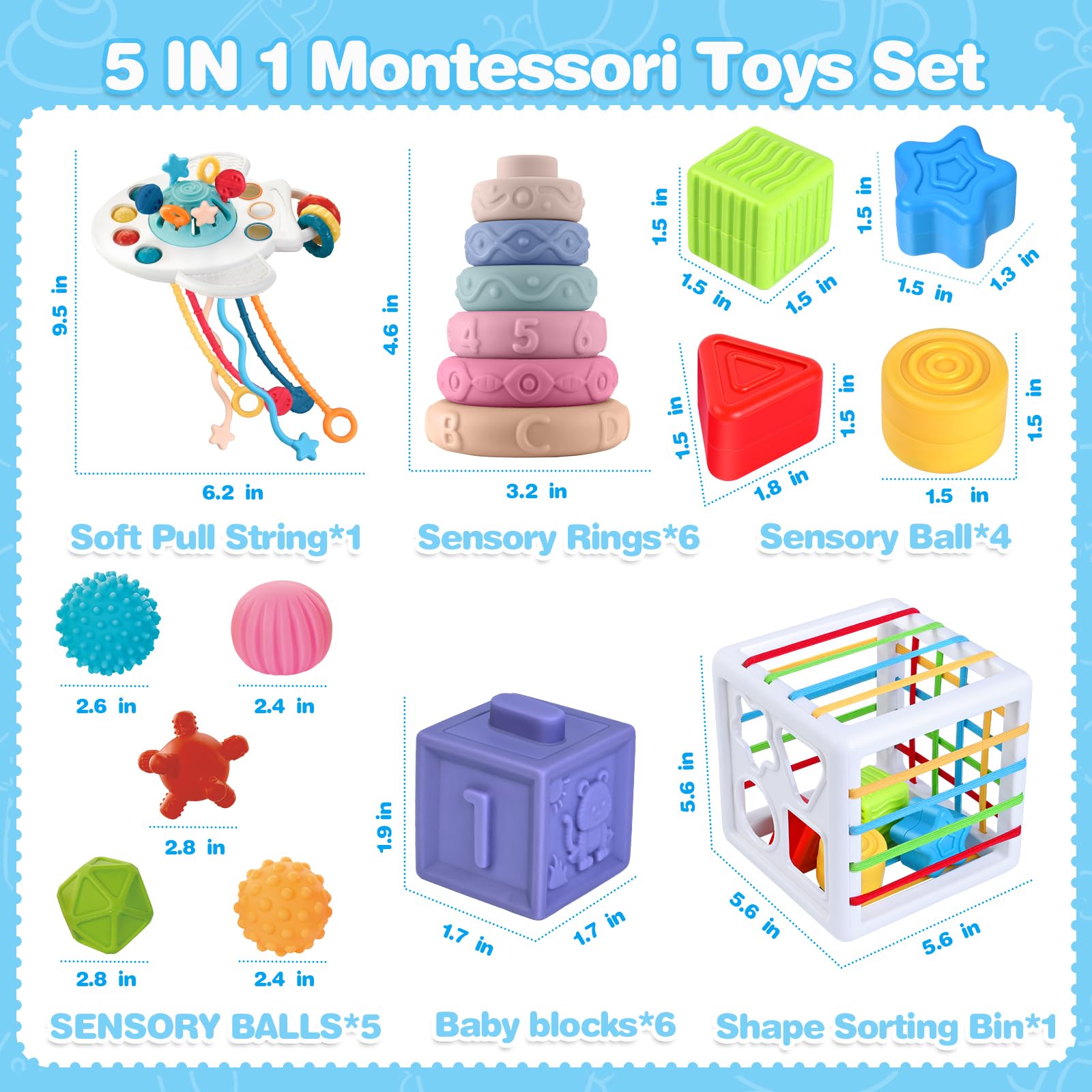 - Q: What age group is the 5 in 1 Montessori toy set suitable for? A: The 5 in 1 Montessori Toys are designed for babies and toddlers aged 0 to 18 months, making them perfect for infants as they grow and develop their motor skills.