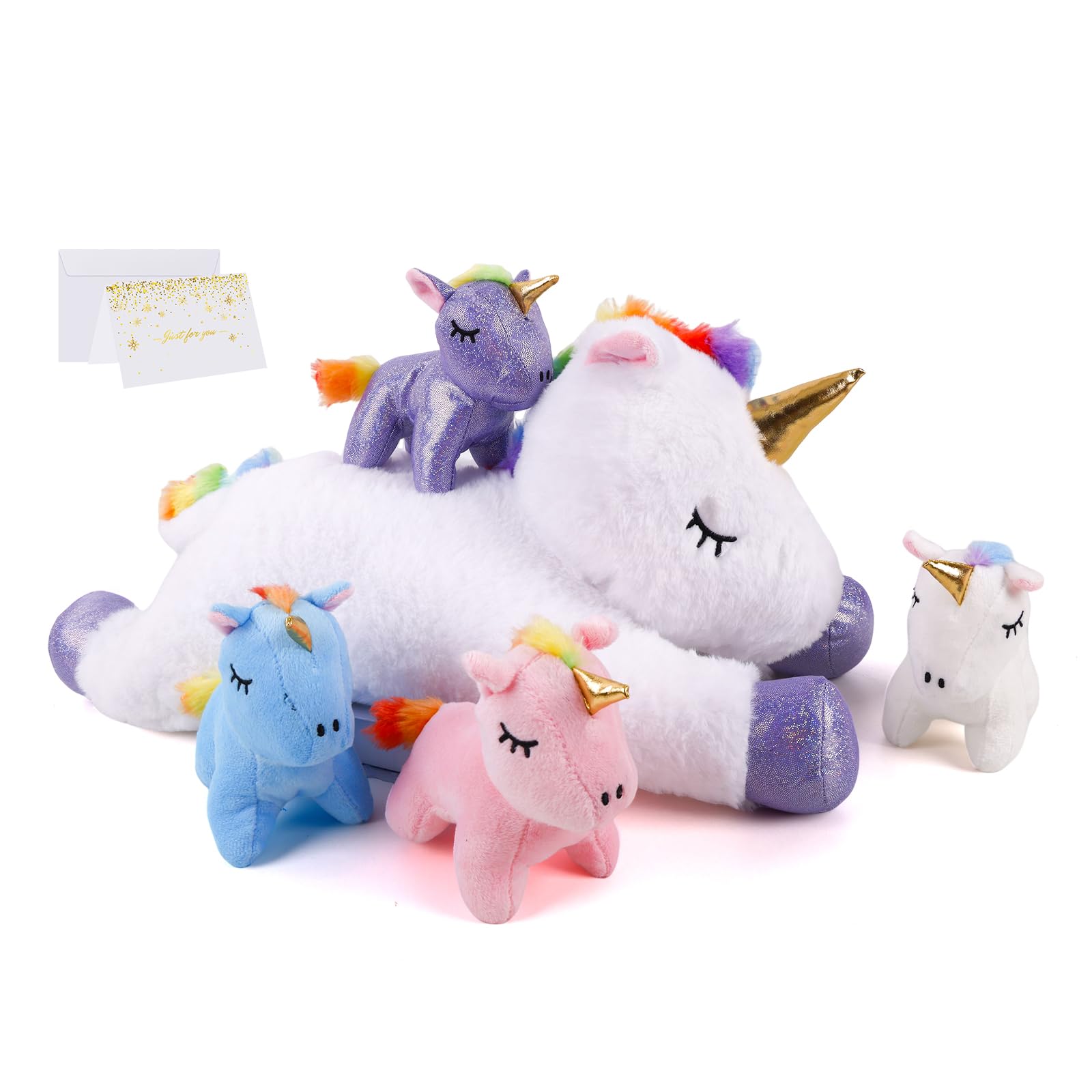 5 Pieces Magical Creature Stuffed Animals For Girls, 1 Big Mommy With 4 Mini Babies, Soft Plush Toys For Kids Ages 3 And Up,Grea