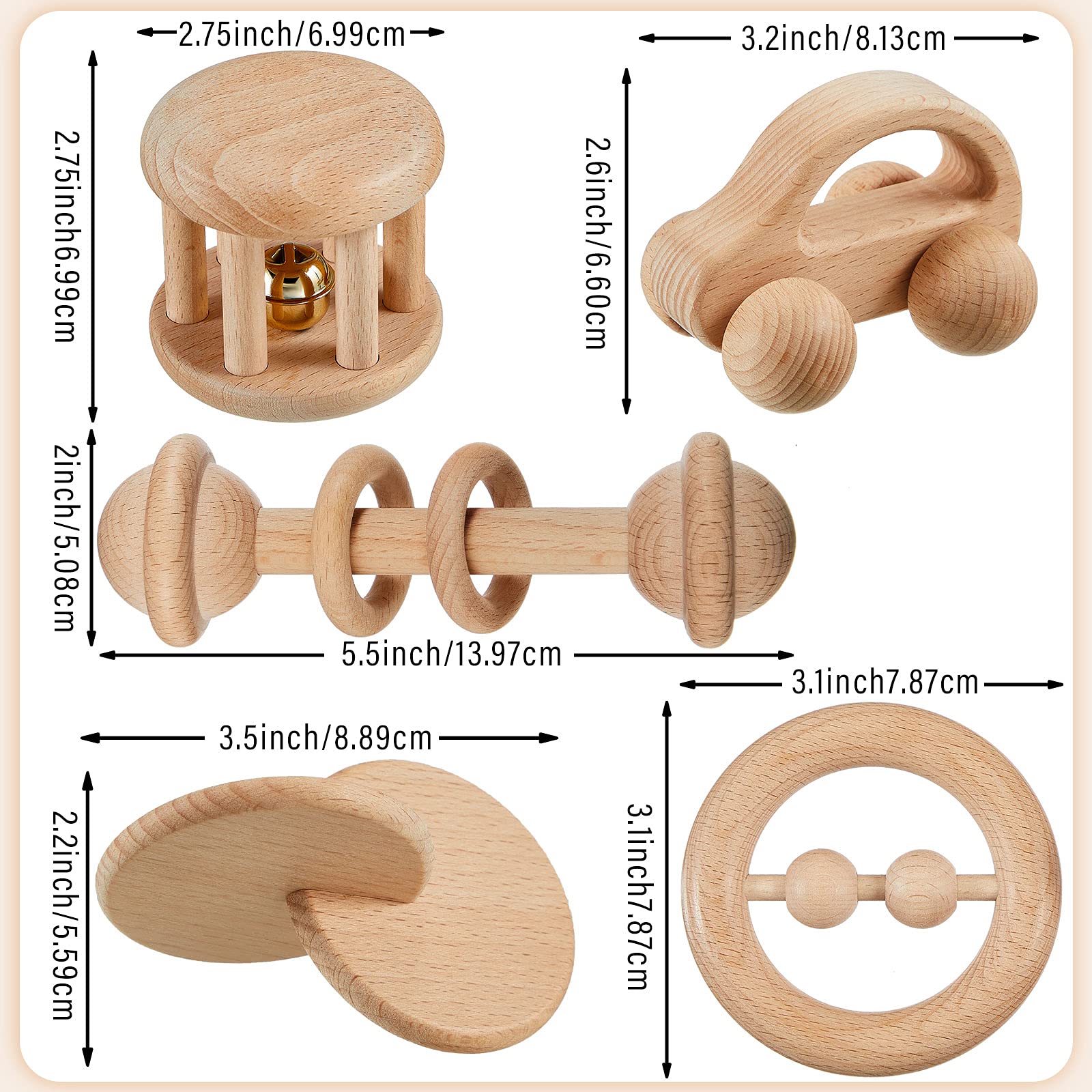 5 Pieces Wooden Baby Toys Wooden Toys For Babies 0-6-12 Months Wood Toys Rattles With Bells Montessori Wood Baby Push Car Wooden Newborn Toy For Infant Boys And Girls Gifts