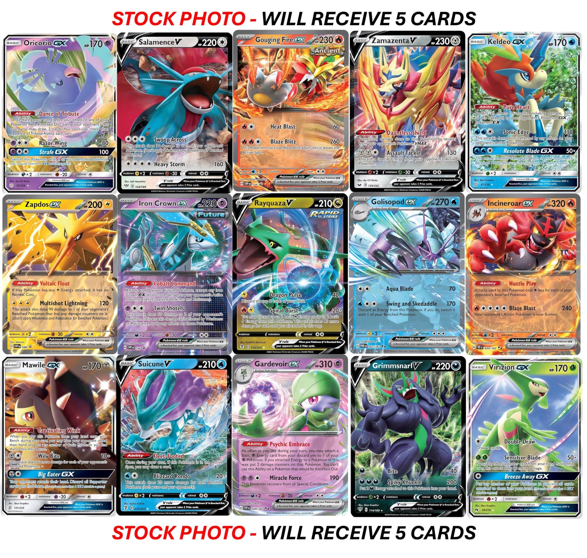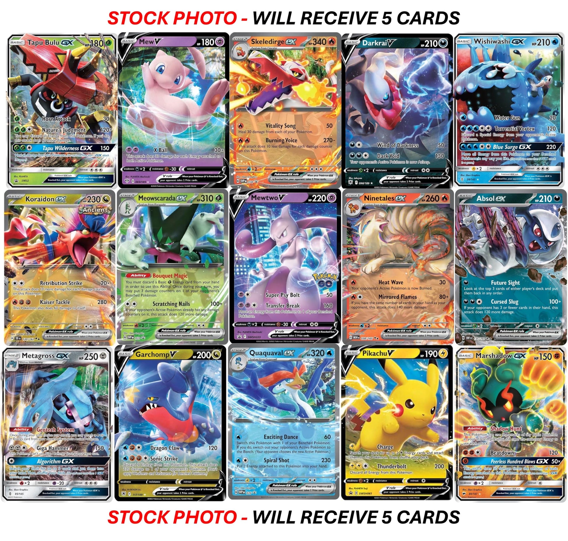 5 Pokemon Ultra Rare Card Lot - V, Gx, Ex, Assorted Variety - No Duplicates
