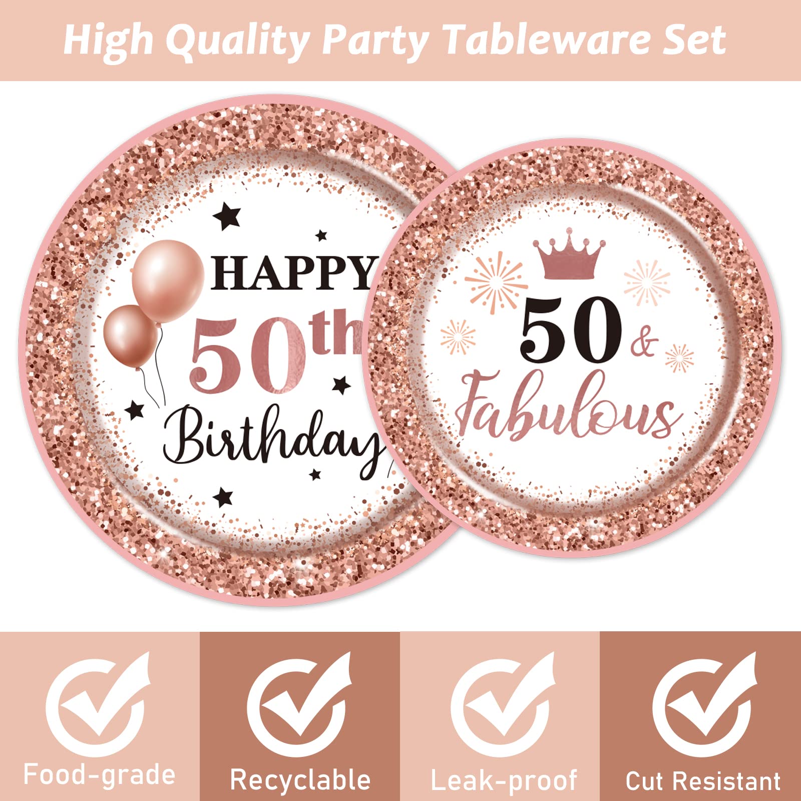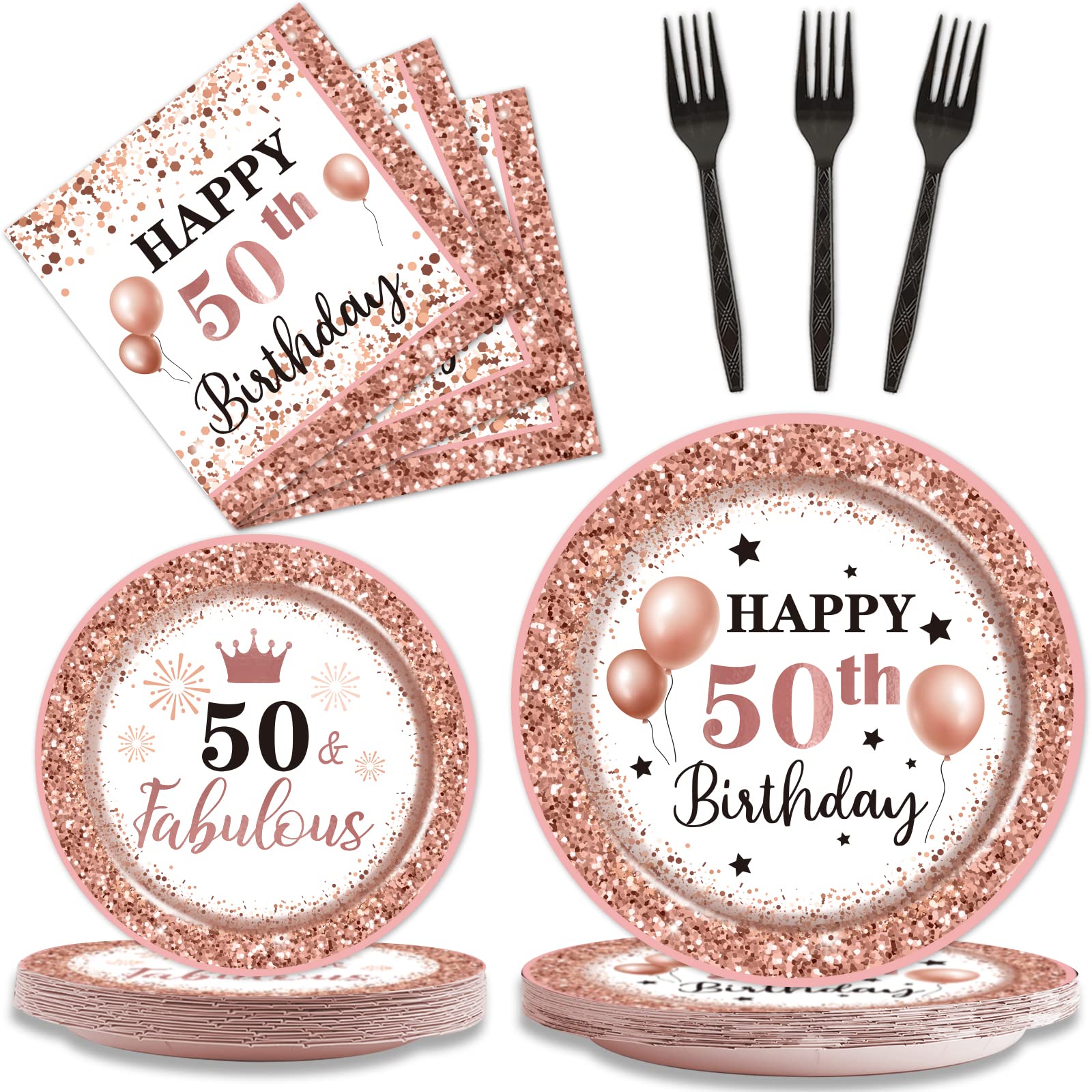 50 And Fabulous Birthday Decorations For 24 Guests,Rose Gold 50Th Birthday Plates And Napkins Tableware Set Disposable Fifty Bir