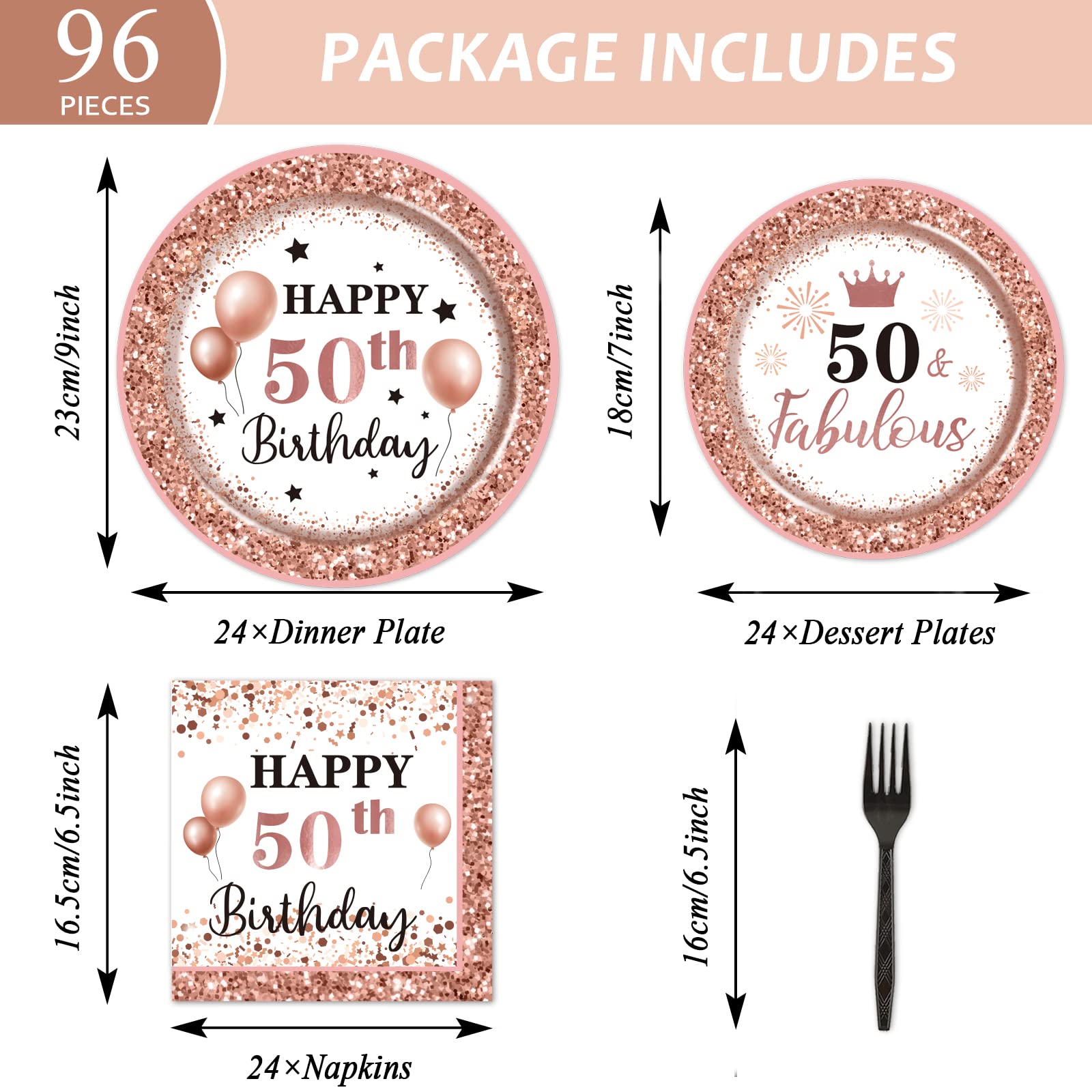- Q: What occasion is this party set best suited for? A: This 50 and Fabulous Birthday Party tableware set is specifically designed for 50th birthday celebrations, featuring an elegant rose gold design that complements various party decorations and themes.