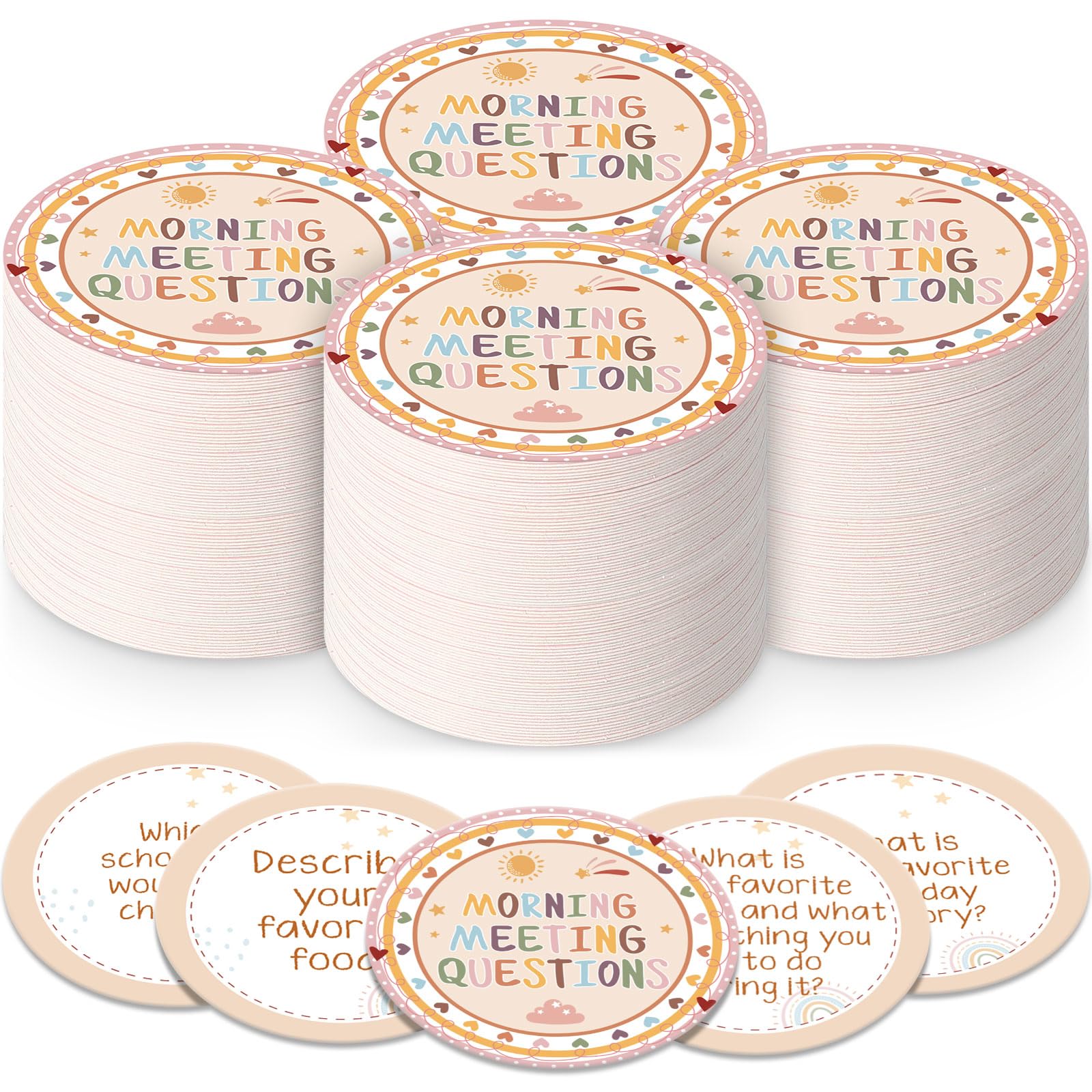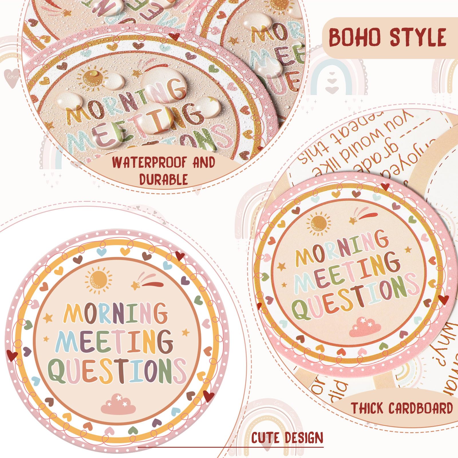 50 Morning meeting questions cards for students, classroom questions ideas cards for activity sharing conversationClassroom question cards: These cards are designed with 50 different questions, allowing you to get to know thoughts and feelings of students, makes them think deeply and share there thoughts. Durable and vibrant: Each morning meeting card is made of quality card stock papers, stylish and fun design with words in smooth touch surface paper, double side printed and laminated. Various usage: You can use these cards on morning meeting, daily class activities, back to school activities or any other occasions with you students. Use them as journal/ bell work promptsSpecifications: Material: card stockSize: each card measures approx. 6 cm/ 2.36 inch in diameterPackage includes: 50 x Morning meeting cards
