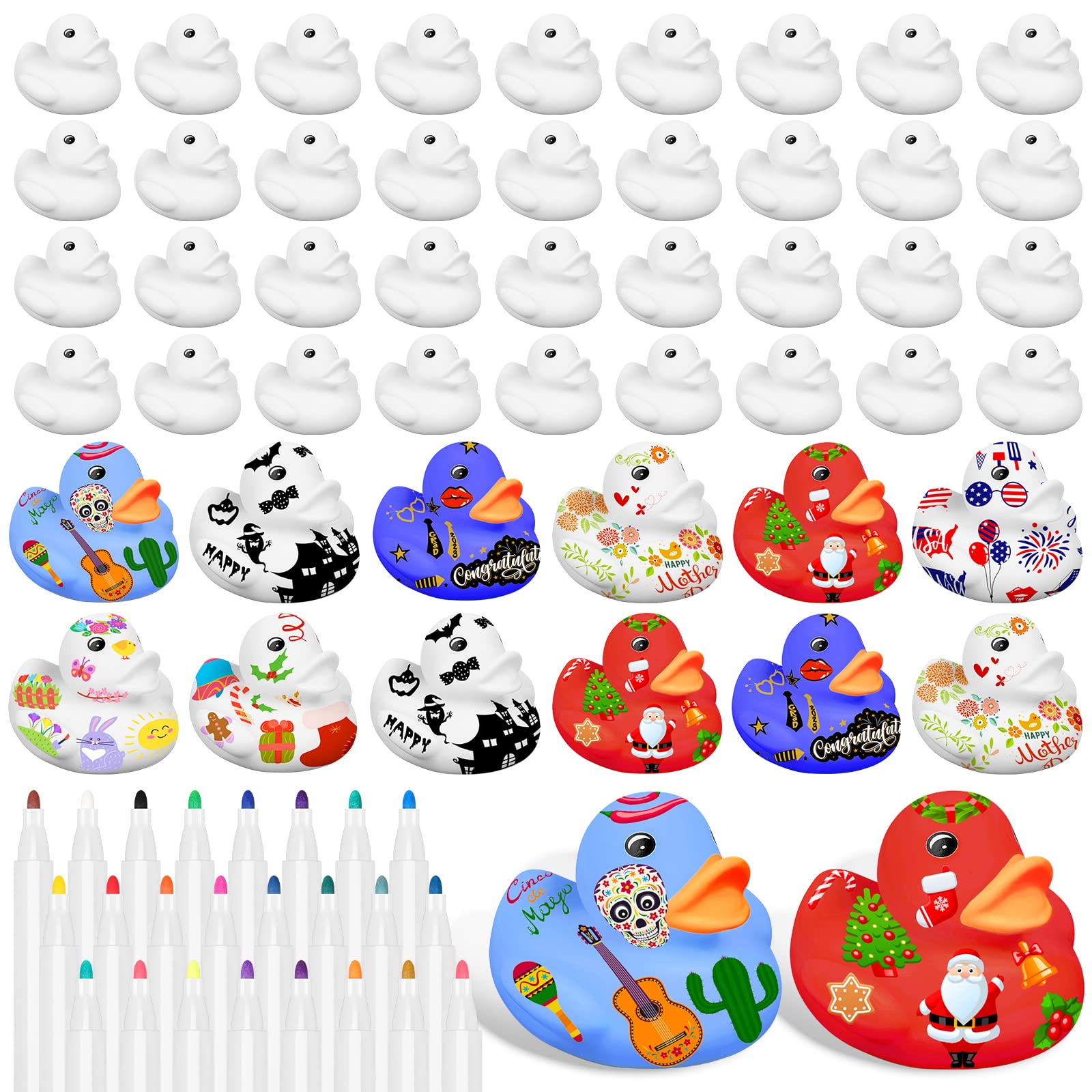 Package Contents: You will receive 50 rubber bath duck toys in different designs and 24 colored pens;Sufficient quantity and different styles meet the needs of childrens happy bathing. | Soft Material: Rubber duck is made of vinyl, which is safe, soft, and elastic, can float on the water, can be squeezed and has a good touch, and children can use it with confidence. can be applied by you repeatedly for a long time, allowing you and your little family members to enjoy these fun DIY projects together. | Attraction: you can use the DIY rubber ducks to decorate your house, which also can be placed on the window sills, at living rooms, bathrooms, study rooms, etc., to add a novel style and a lot of fun to your home. | Compact and Interesting: Bathing rubber duck is light in weight and can float on the water. It is a bathing partner for children and enriches childrens bathing experience. | Wide Applications: Rubber Duck Bath Toy Set is not only used as a baby shower toy, but also as a decoration to dress up the scene, or as a gift, Halloween Xmas party favor for carnivals, birthday parties, and more.