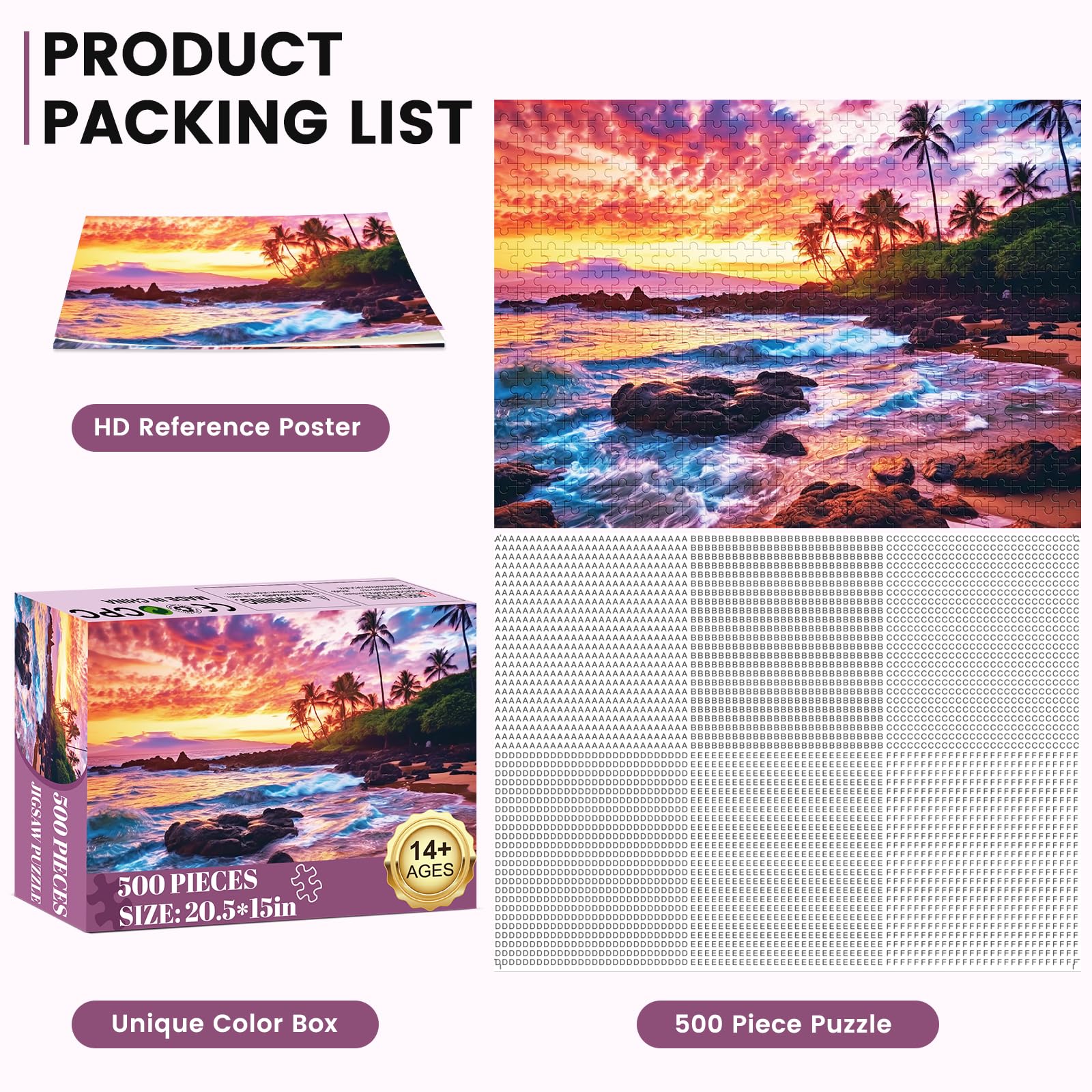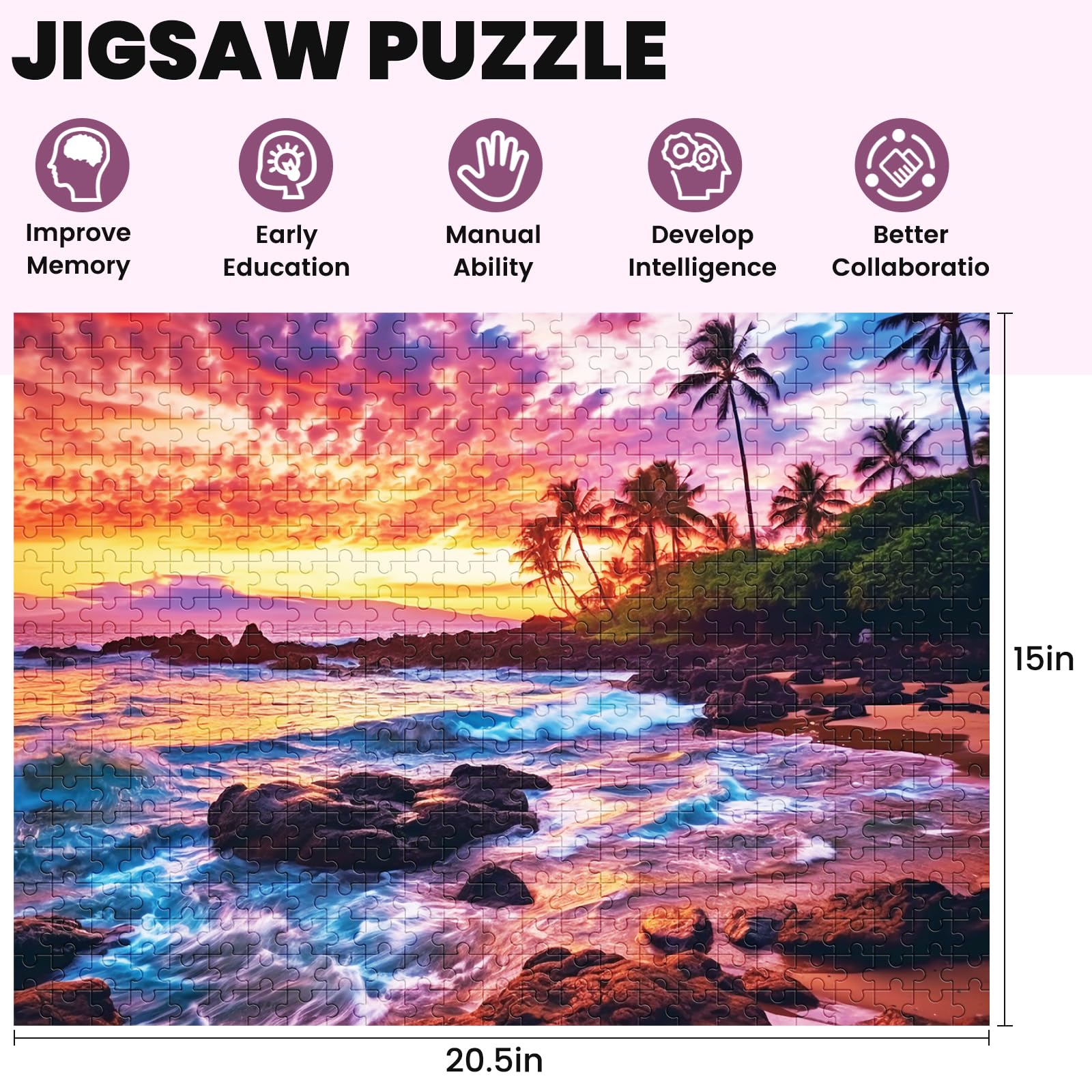 - Q: What are the dimensions of the completed 500-piece beach puzzle? A: The completed 500-piece beach puzzle measures 20.5 x 15 inches (52 x 38 cm).