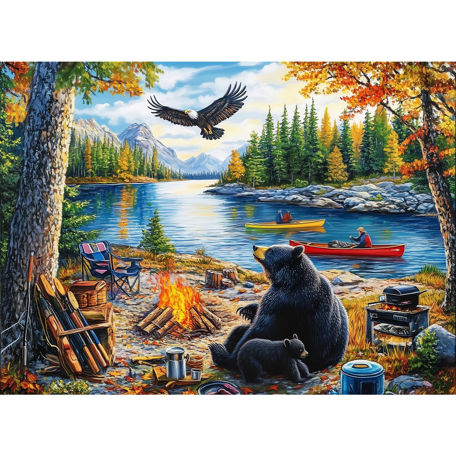 Experience the beauty of nature with our 500 Piece Puzzles for Adults. This exquisite jigsaw puzzle features a captivating scene of majestic black bears and soaring eagles gathered around a cozy bonfire, providing a serene riverside setting that is perfect for all ages. Measuring 20.5 x 15 inches (52 x 30 cm) when completed, it serves not just as a puzzle but also as a stunning piece of wall art.