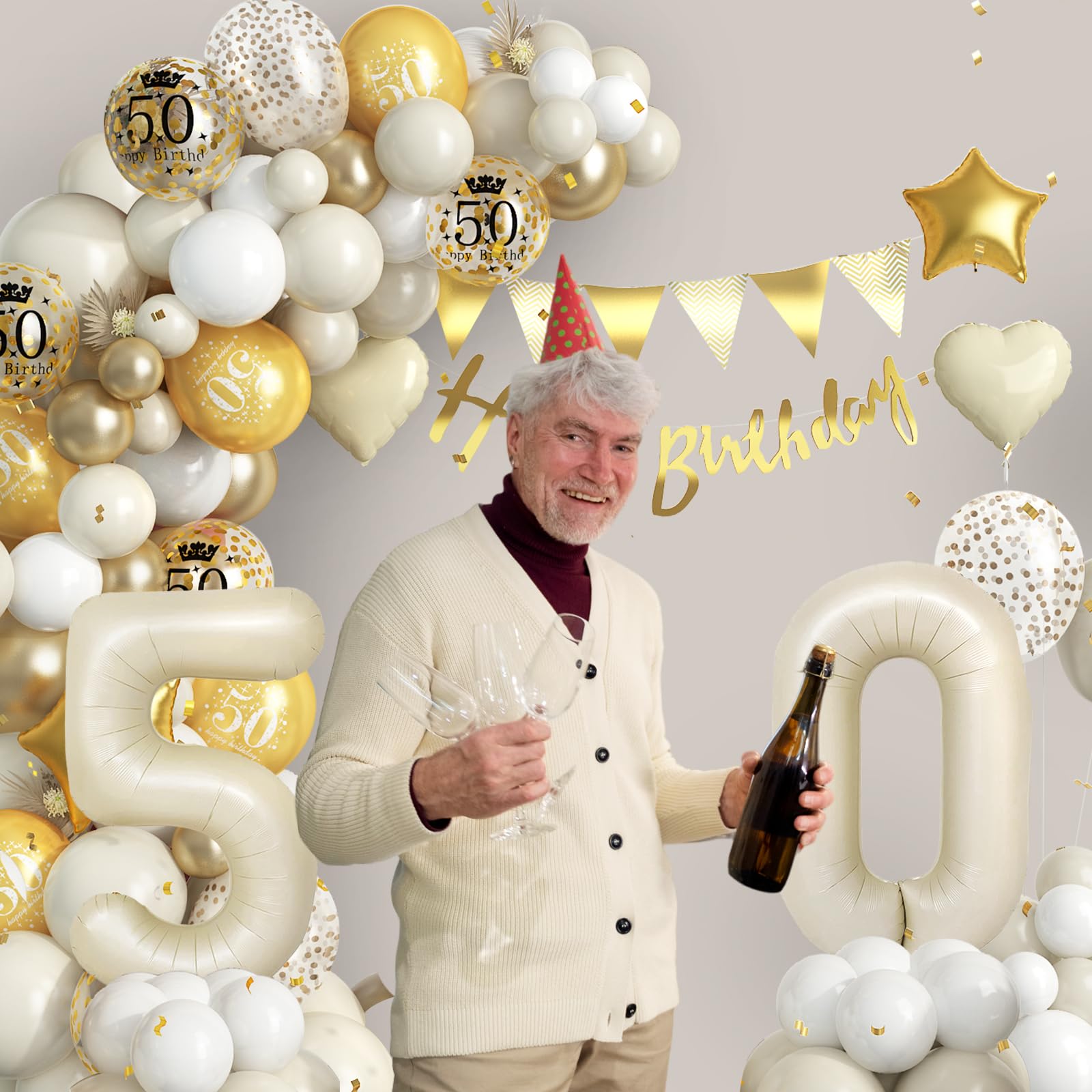 50Th Birthday Decorations Sand White Gold,50Th Birthday Balloon Arch Garland Kit With Happy 50Th Birthday Number 50 Foil Balloons,Happy Birthday Banner For Women Men 50Th Birthday Party Decoration