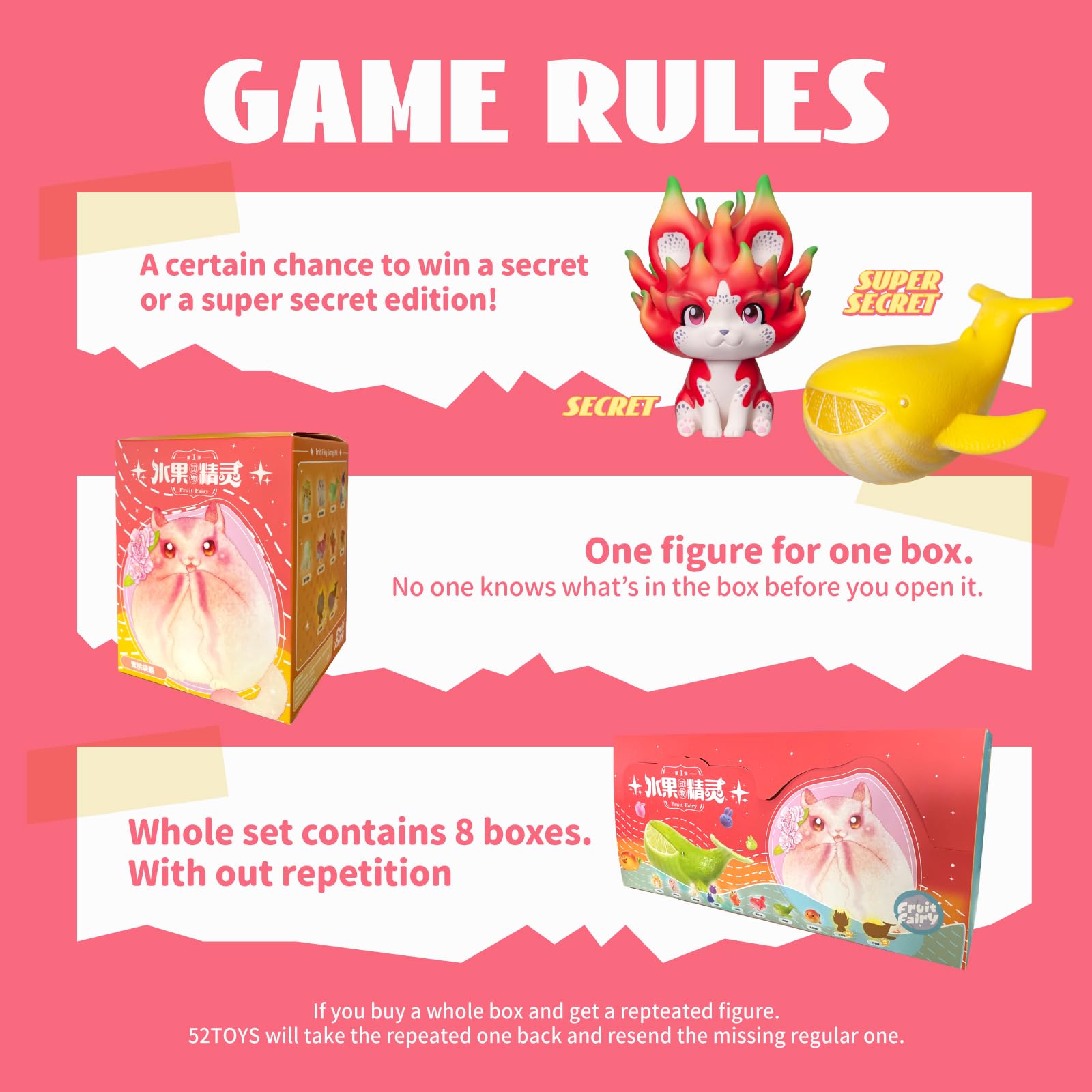 - Q: Can I get a random figure from the Fruit Fairy Series? A: Yes, the 52TOYS Fruit Fairy Action Figure comes with a random selection from the series. Each box contains one figure, and there's a chance to find a secret edition, which is approximately 1 in 96 boxes.