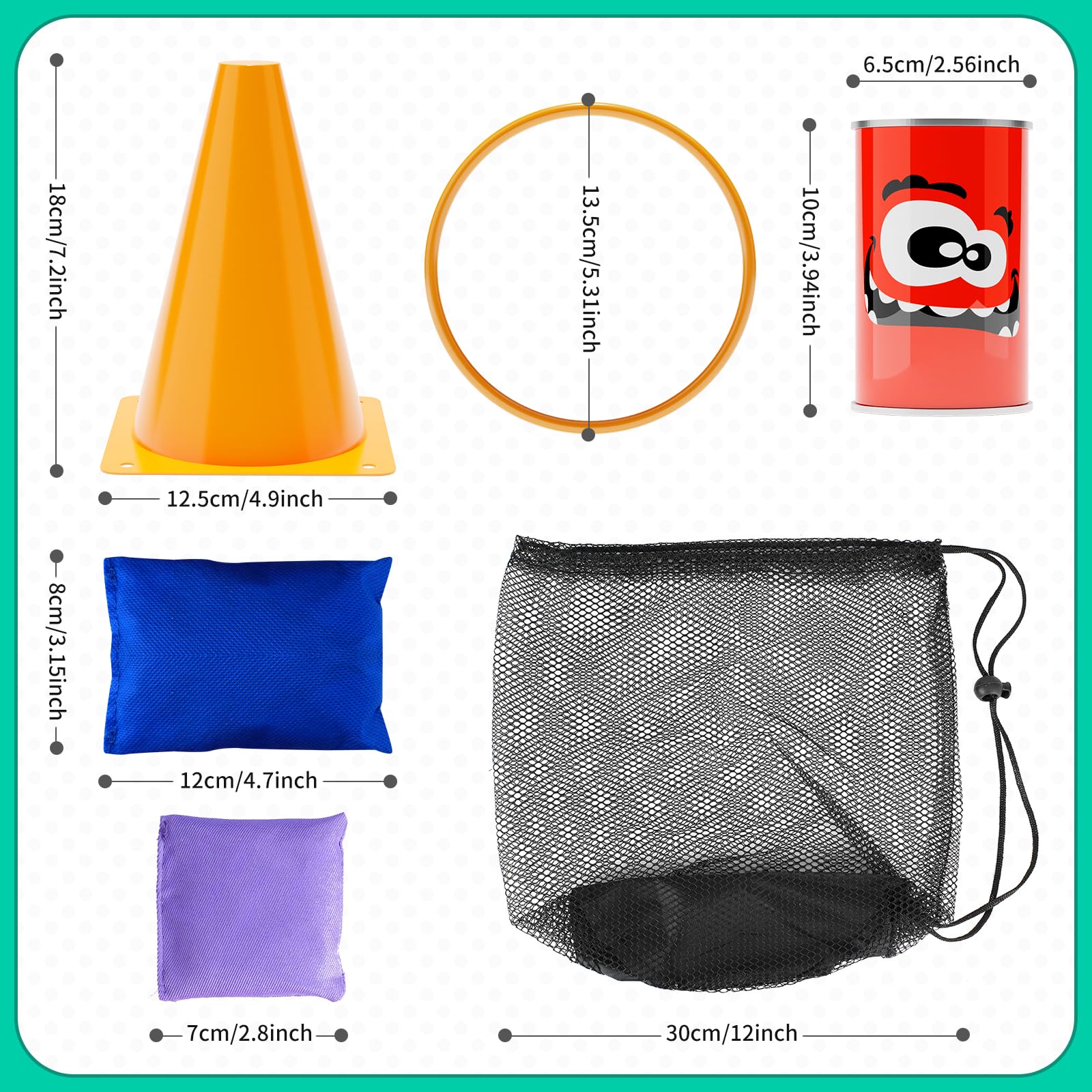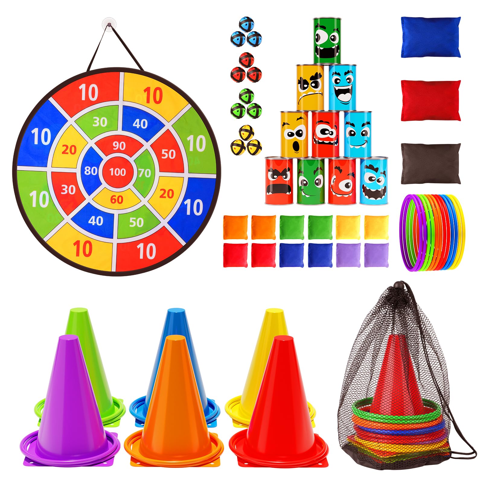 - Q: What games are included in the 58PCS Carnival Games Combo Set? A: The 58PCS Carnival Games Combo Set includes a dart board with 12 sticky balls, a knockdown can game with 10 tin cans and 3 big bean bags, and a ring toss game featuring 6 safety cones. This combination allows for various fun game modes suitable for all ages.