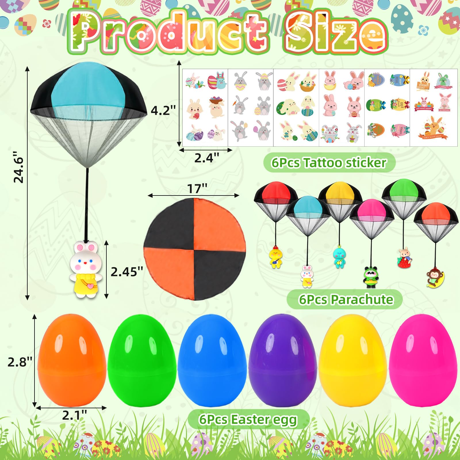 6 Pack Prefilled Easter Eggs With Parachute Toys Inside, Parachute Toys For Kids With 35 Pcs Easter Temporary Tattoos Easter Bas