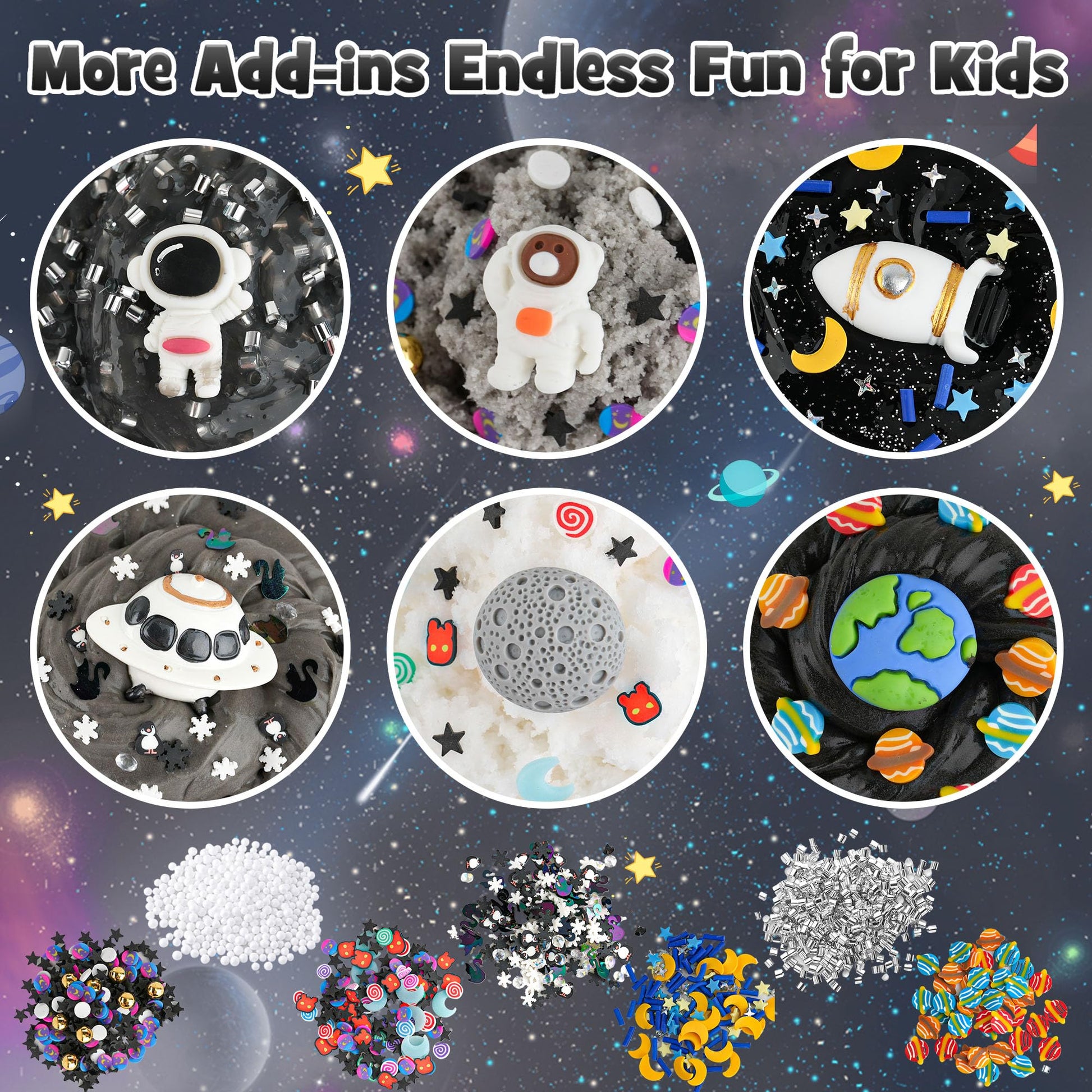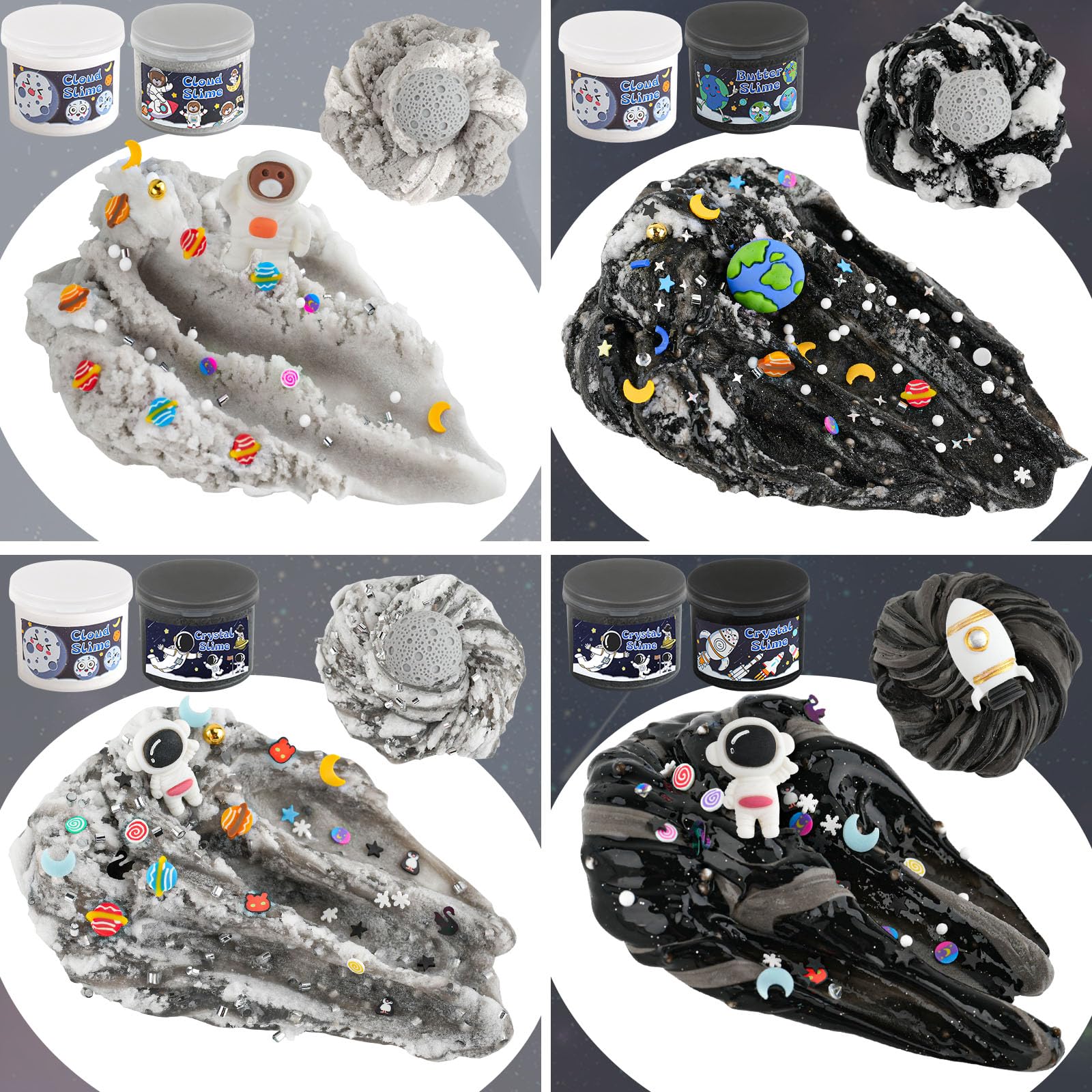 - Q: What types of slime textures are included in the Galaxy Slime Kit? A: The Galaxy Slime Kit includes three different textures: two packs of black butter slime, two packs of white and grey cloud slime, and two packs of black clear slime, totaling 360ml of unique slime experiences.