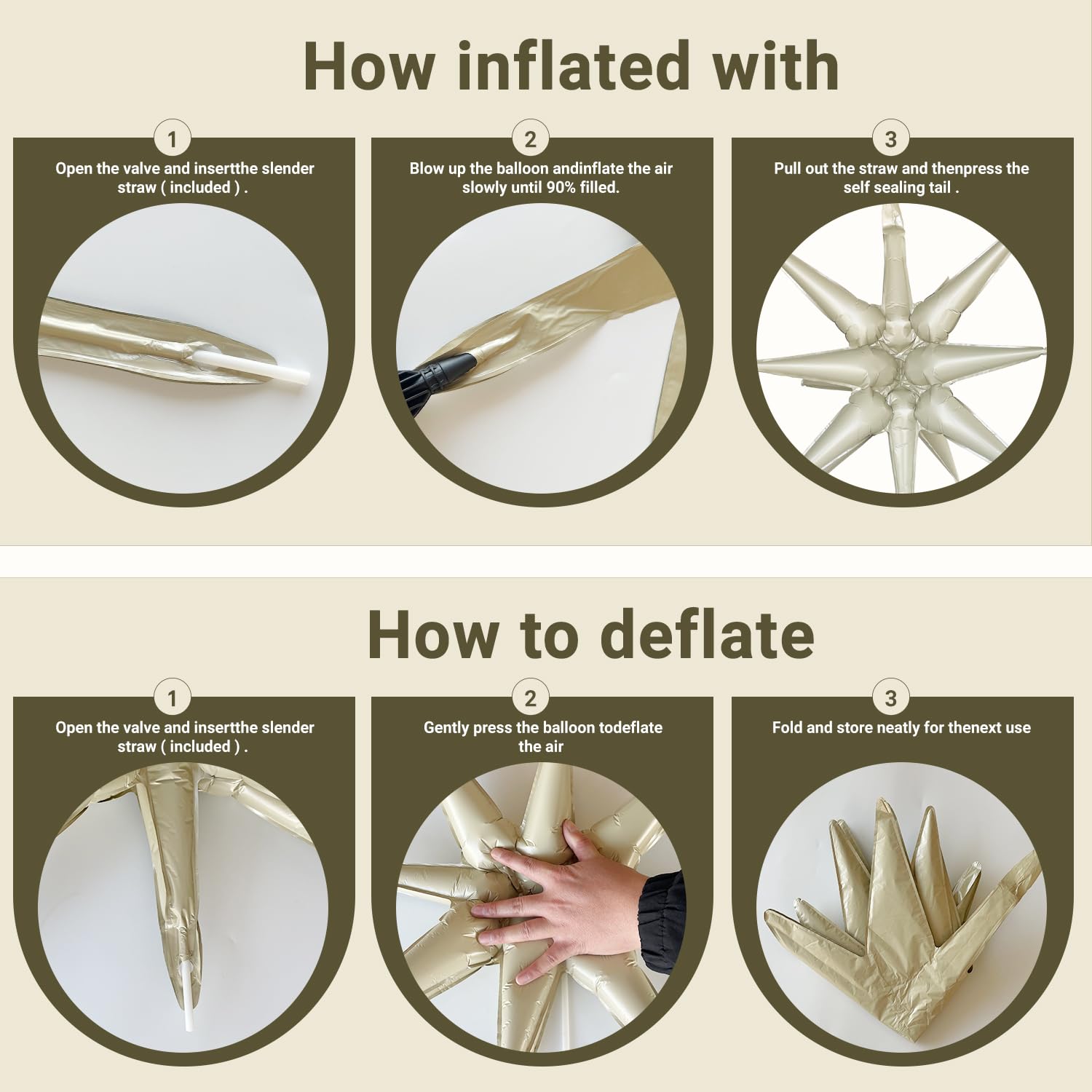 6 Pack 14 Point Foil Cone Balloons Starburst Cone Mylar Balloons Large Explosion Star Balloon For Wedding Birthday Party Photo Booth Decoration Supplies, White One-Piece 14-Pointed Star Explosion Balloons 6 Pcs Product Specification: Material: Aluminum Foil. Package Contents: 6Pcs Cream Color Explosion Star Balloons Size: Each Foil Cone Balloon Measures Approx 22 Inches After Inflation Easy To Use: Use The Inflator To Pump The Foil Disco Ball Balloon To 80% By Air Or Helium, When Inflation Being Completed, Pull Out The Inflator And Pinch The Inflation Inlet Flat. The Air Outlet Will Be Automatically Sealed By Its Matched Self Adhesive Glue Of The Balloons Inlets, And No Additional Knots Are Required (Inflator Is Not Included).