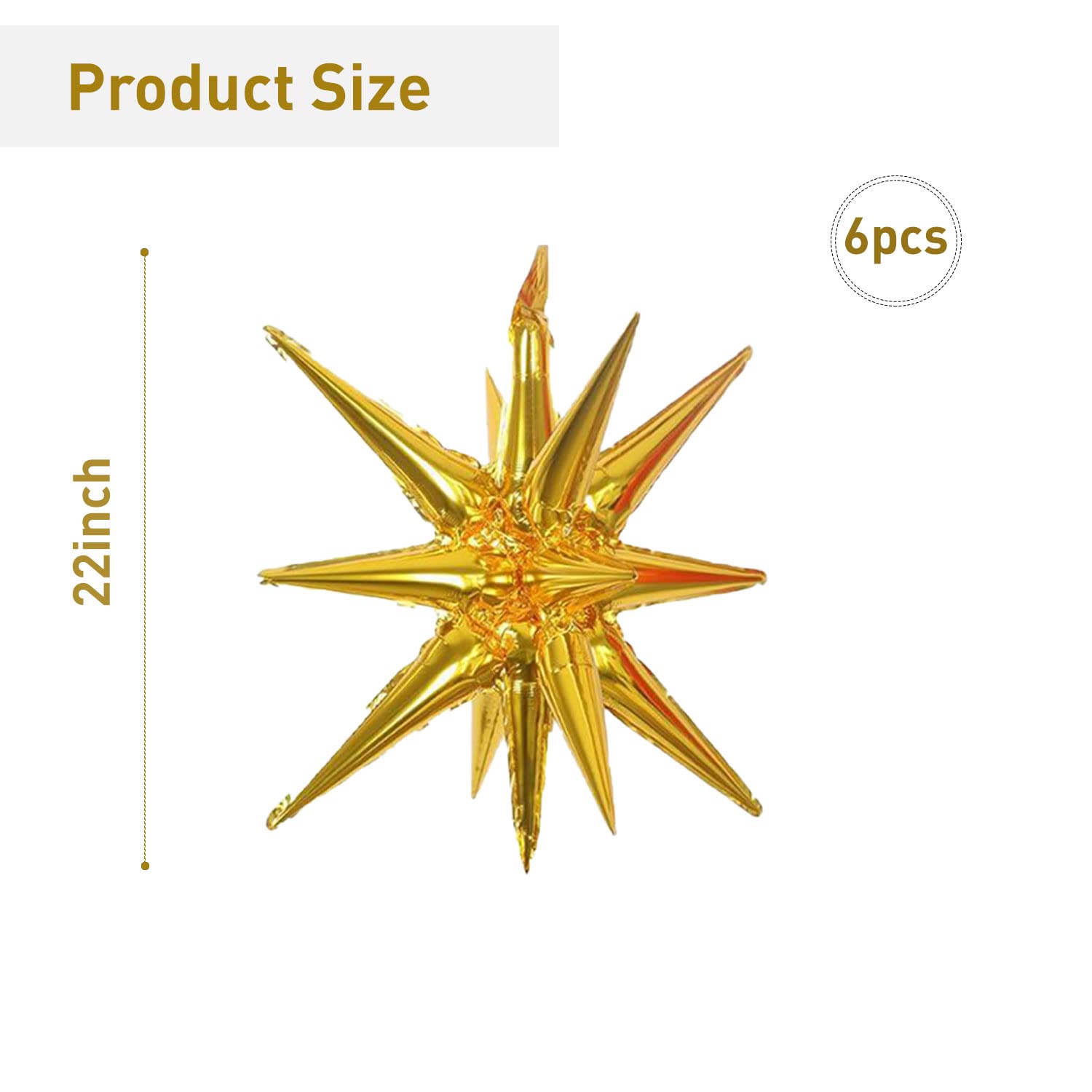 6 Pack 14 Point Foil Cone Balloons Starburst Cone Mylar Balloons Large Explosion Star Balloon For Wedding Birthday Party Photo Booth Decoration Supplies, Gold One-Piece 14-Pointed Star Explosion Balloons 6 Pcs Product Specification: Material: Aluminum Foil. Package Contents: 6Pcs Gold Explosion Star Balloons Size: Each Foil Cone Balloon Measures Approx 22 Inches After Inflation Easy To Use: Use The Inflator To Pump The Foil Disco Ball Balloon To 80% By Air Or Helium, When Inflation Being Completed, Pull Out The Inflator And Pinch The Inflation Inlet Flat. The Air Outlet Will Be Automatically Sealed By Its Matched Self Adhesive Glue Of The Balloons Inlets, And No Additional Knots Are Required (Inflator Is Not Included).